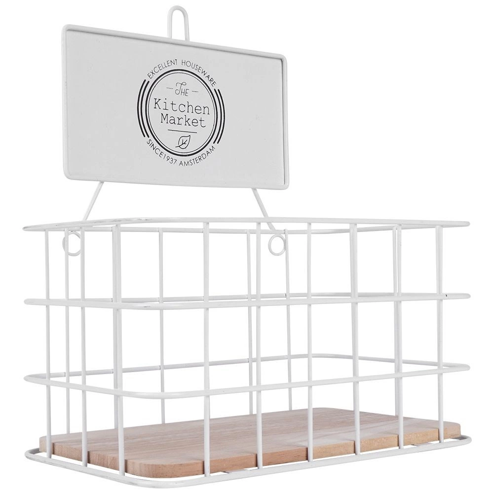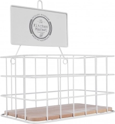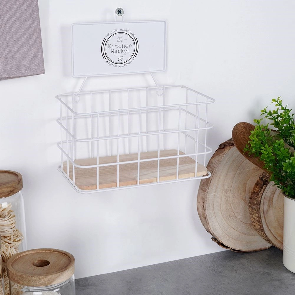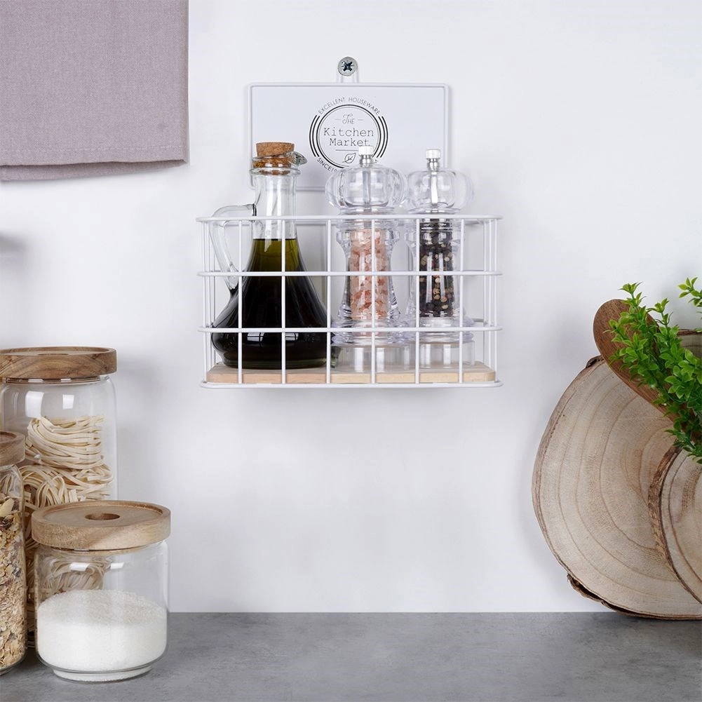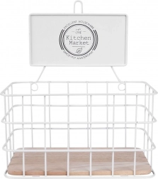 Táto nadčasová kuchynská polička v kombinácii bieleho kovu a dubového dreva skvelo zapadne do moderných aj klasických interiérov. Otvorený drôtený dizajn zabezpečuje prehľadnosť a rýchly prístup k uloženým predmetom, dekoratívny nápis „The Kitchen Market“ dodáva šarm.