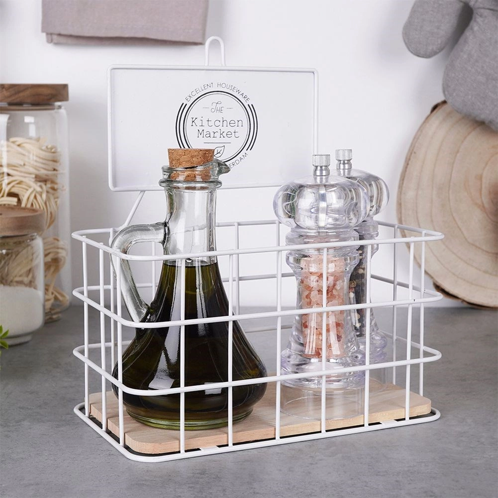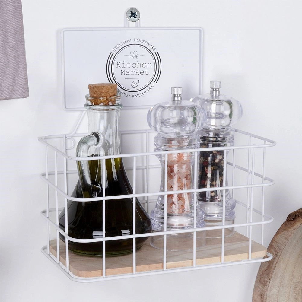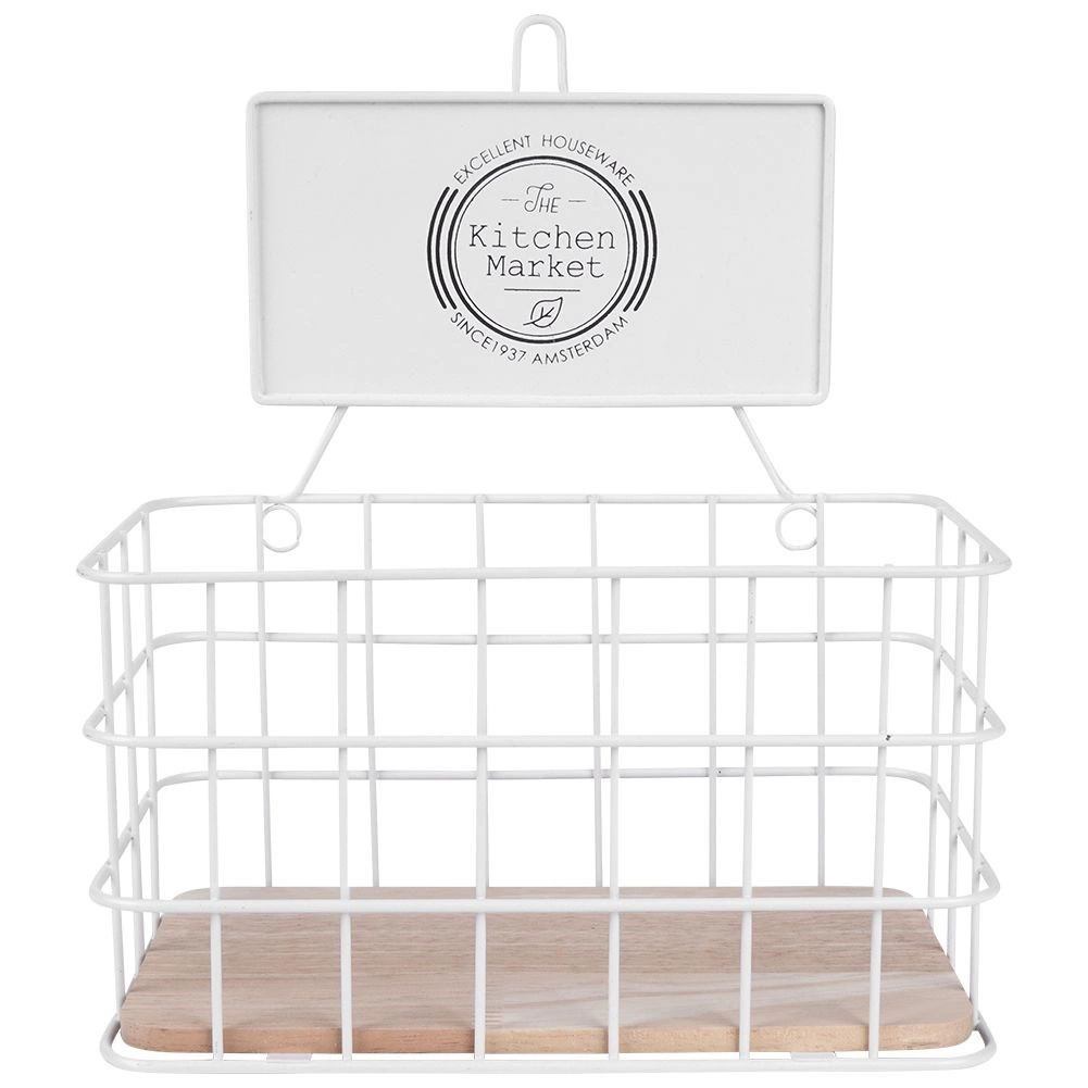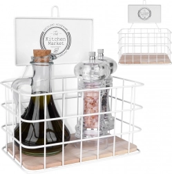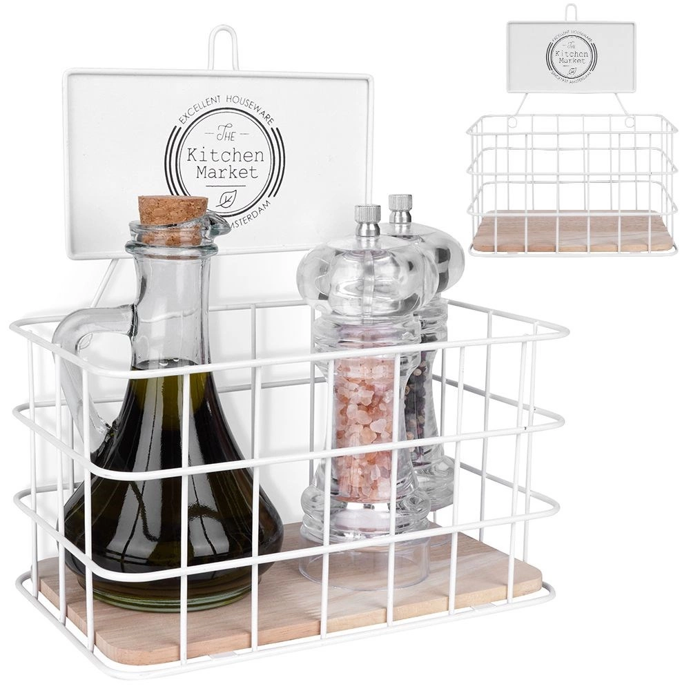 Táto nadčasová kuchynská polička v kombinácii bieleho kovu a dubového dreva skvelo zapadne do moderných aj klasických interiérov. Otvorený drôtený dizajn zabezpečuje prehľadnosť a rýchly prístup k uloženým predmetom, dekoratívny nápis „The Kitchen Market“ dodáva šarm.