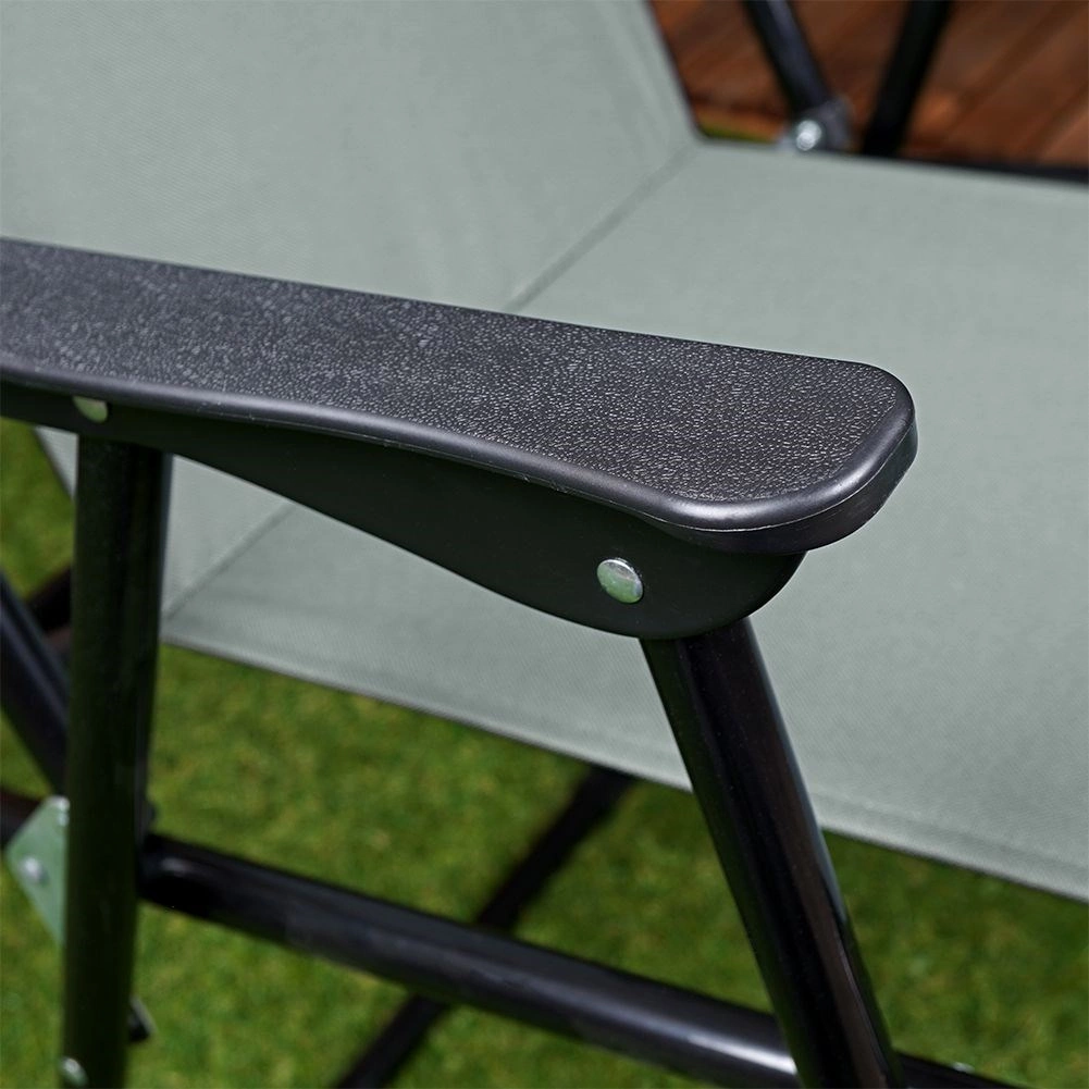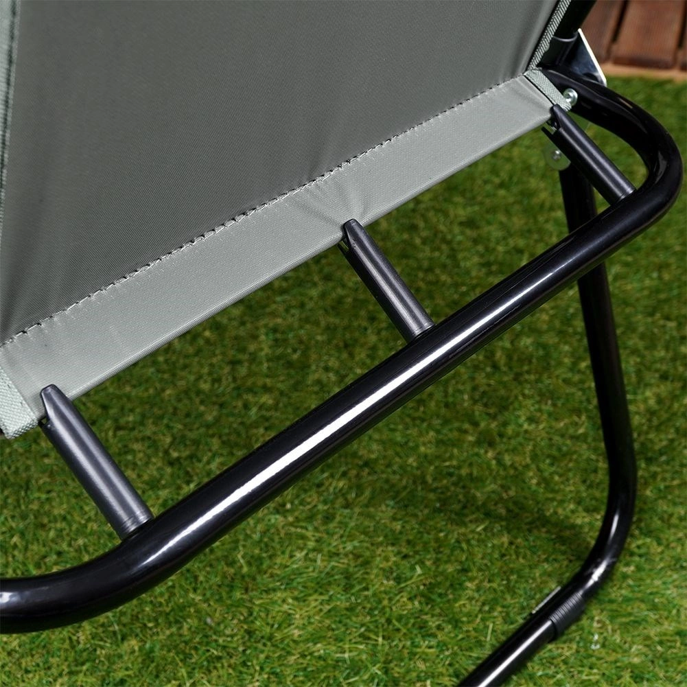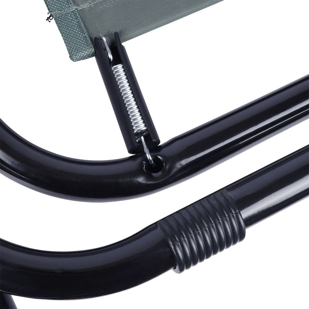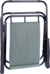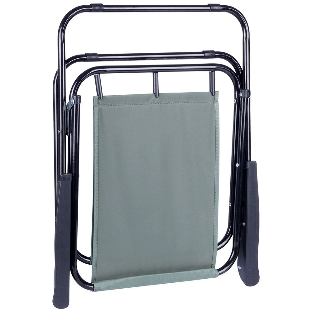 Stolička je vyrobená z kvalitných materiálov: odolná polyesterová tkanina v sivej farbe zvládne každodenné používanie, čierny kovový rám zabezpečuje stabilitu a dlhú životnosť a plastové podrúčky pridávajú na komforte sedenia. Konštrukcia umožňuje rýchle zloženie aj rozloženie v priebehu pár sekúnd.