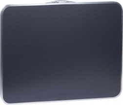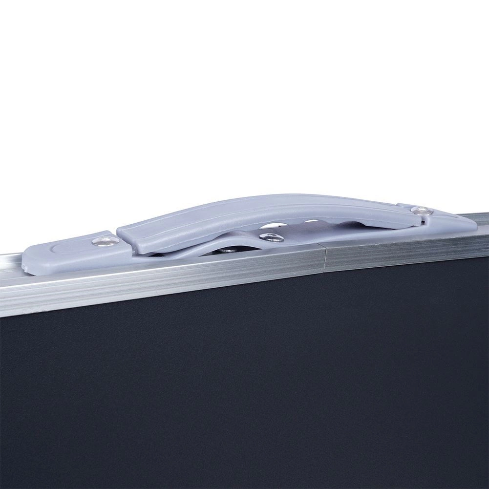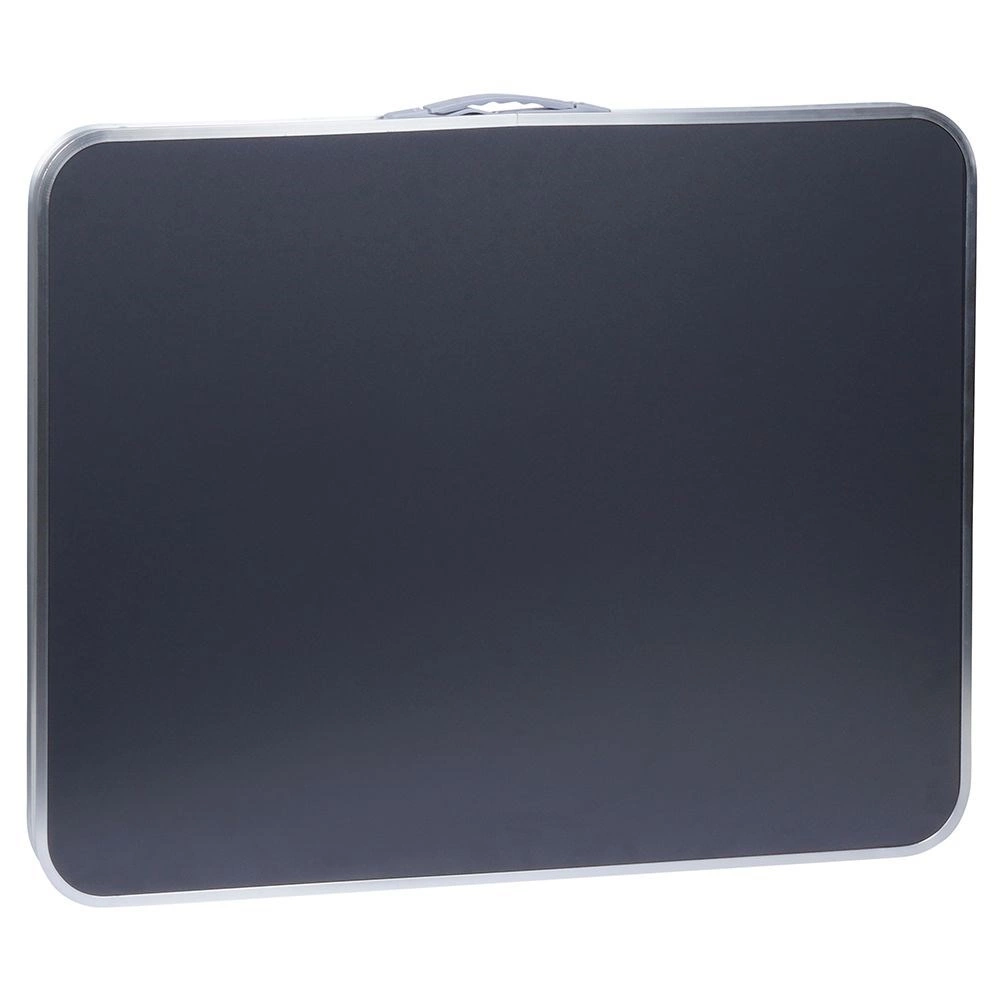Doska z MDF je chránená odolnou povrchovou úpravou, ktorá lepšie znáša vlhkosť a bežné opotrebovanie. Stabilná kovová konštrukcia s hliníkovým lemom drží tvar a dodáva stolu pevnosť. Po zložení má kompaktné rozmery 80 × 61,5 × 6 cm, pod doskou je miesto na uloženie nôh a vďaka integrovanému uchu ho ľahko prenesiete.