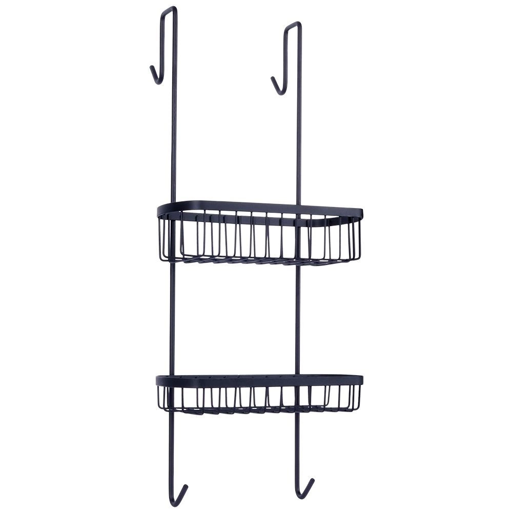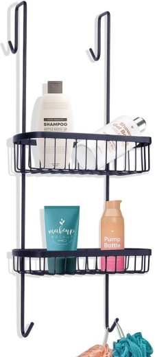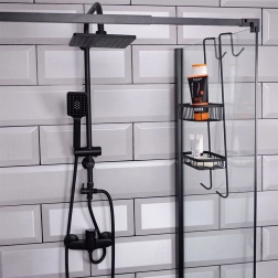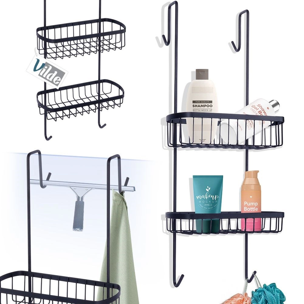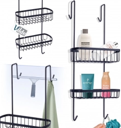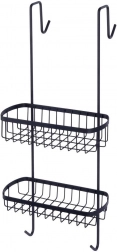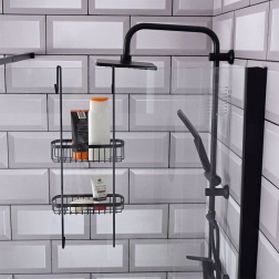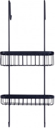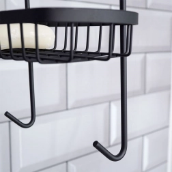 Táto závesná sprchová polička je navrhnutá na zavesenie na hornú hranu sklenej steny sprchového kúta. Vďaka dvom drôteným košíkom a spodným háčikom udrží vaše kúpeľňové potreby prehľadne usporiadané a vždy po ruke. Minimalistický loftový dizajn v čiernej farbe sa hodí do každej modernej kúpeľne.