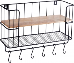 Univerzálna nástenná polica v modernom loft štýle kombinuje čierny matný kov a drevo pre stabilné a odolné uloženie. Ponúka dve úložné úrovne a 6 praktických háčikov na hrnčeky či náradie. Ľahko sa montuje pomocou priložených hmoždiniek a skrutiek a skvele sa hodí do kuchyne, kúpeľne, predsiene aj kancelárie.