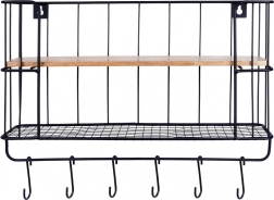 - Funkčné usporiadanie: drevená horná polička, drôtená spodná polica a rada háčikov.