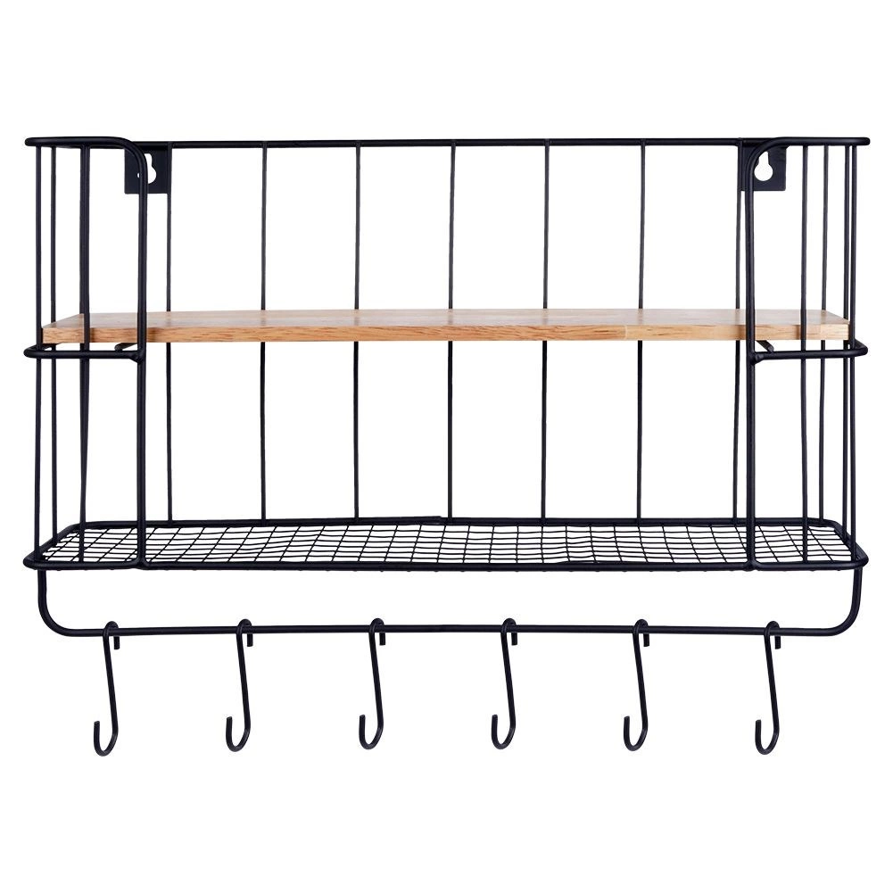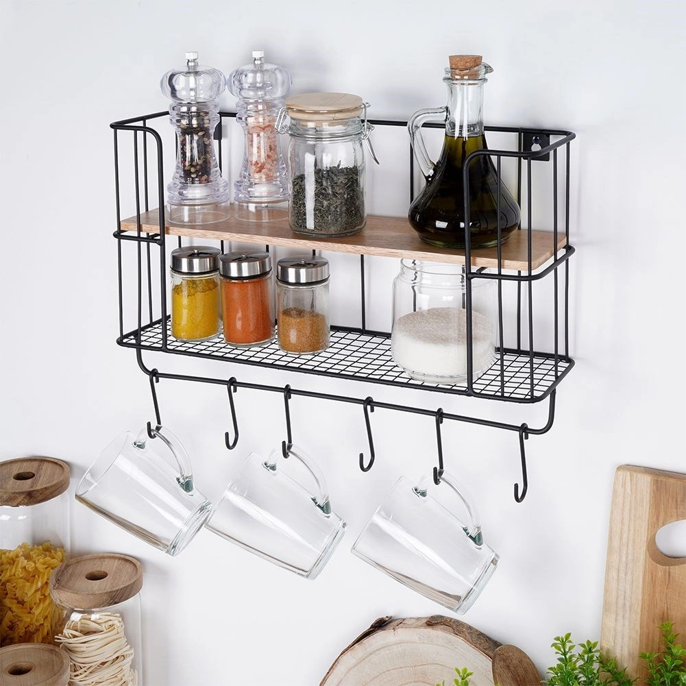 Horná drevená polička a spodná drôtená polica poskytnú miesto na koreniny, dózy aj oleje, zatiaľ čo hrnčeky či náradie zavesíte na háčiky pod nimi.