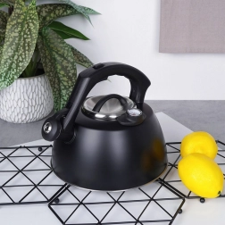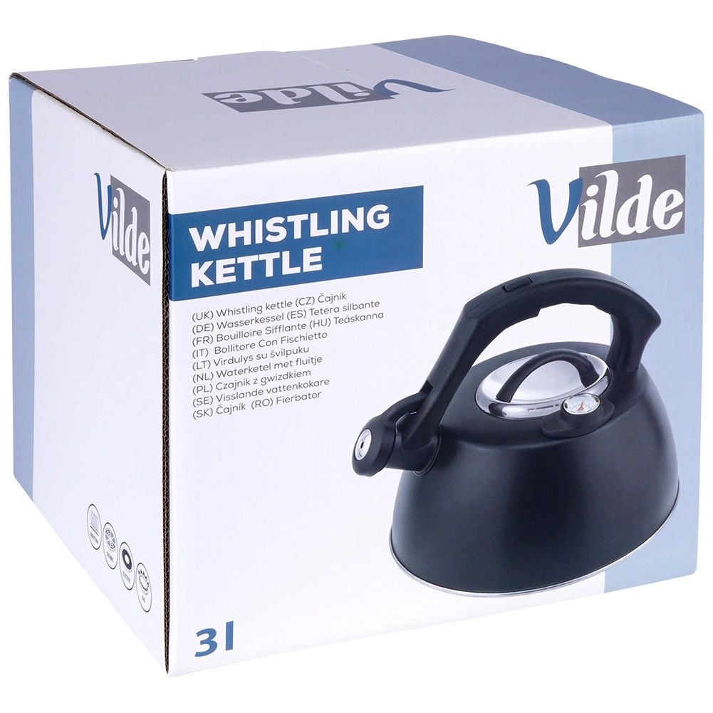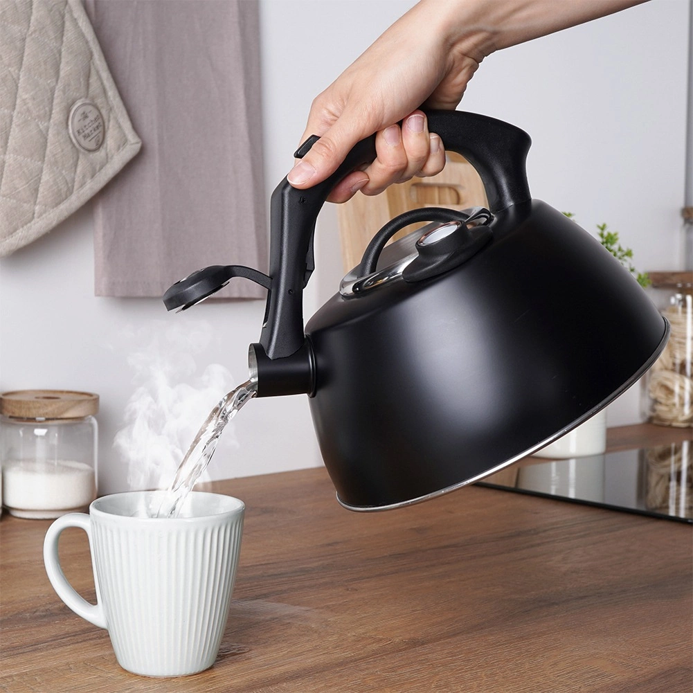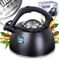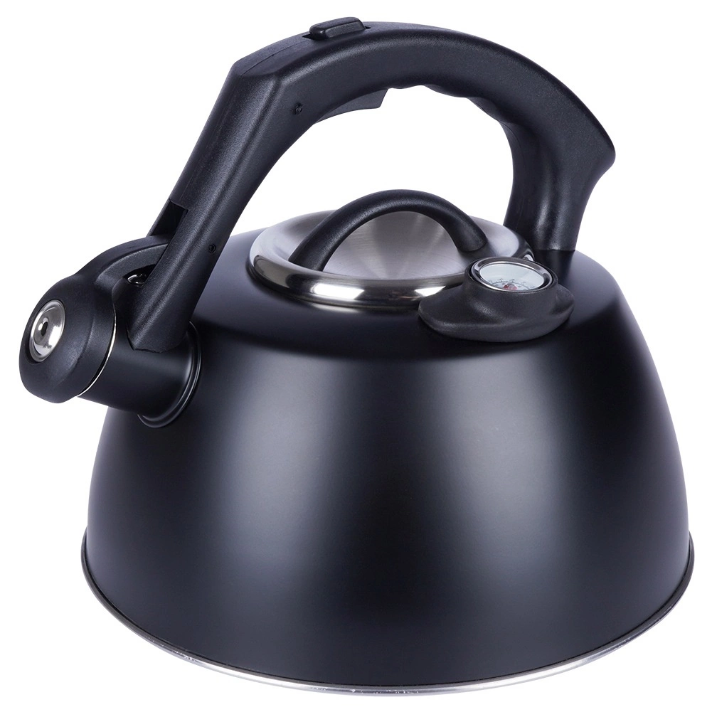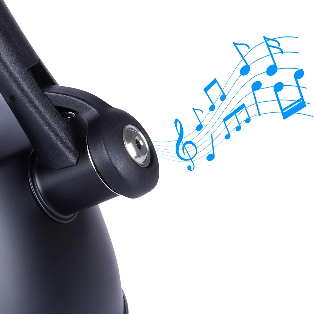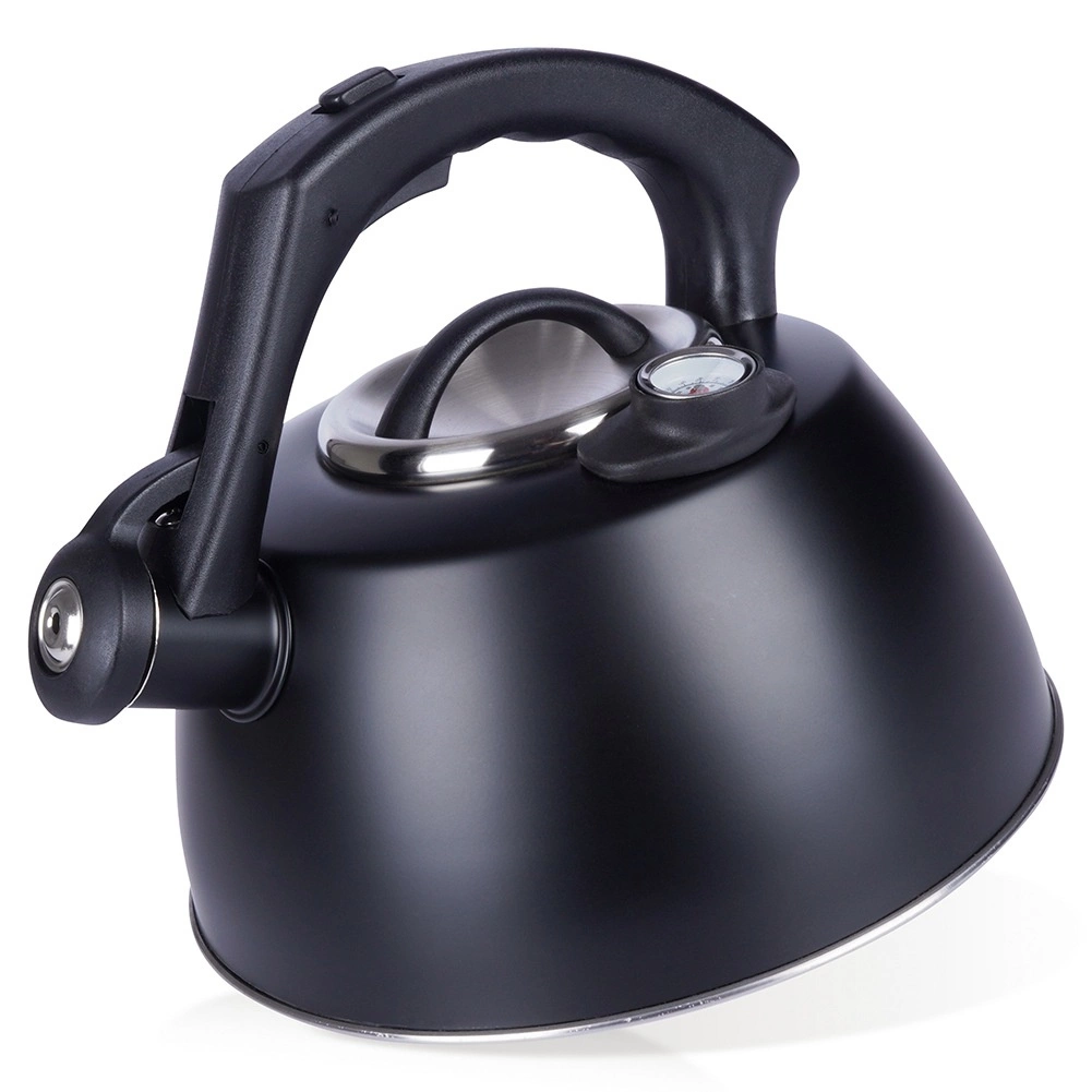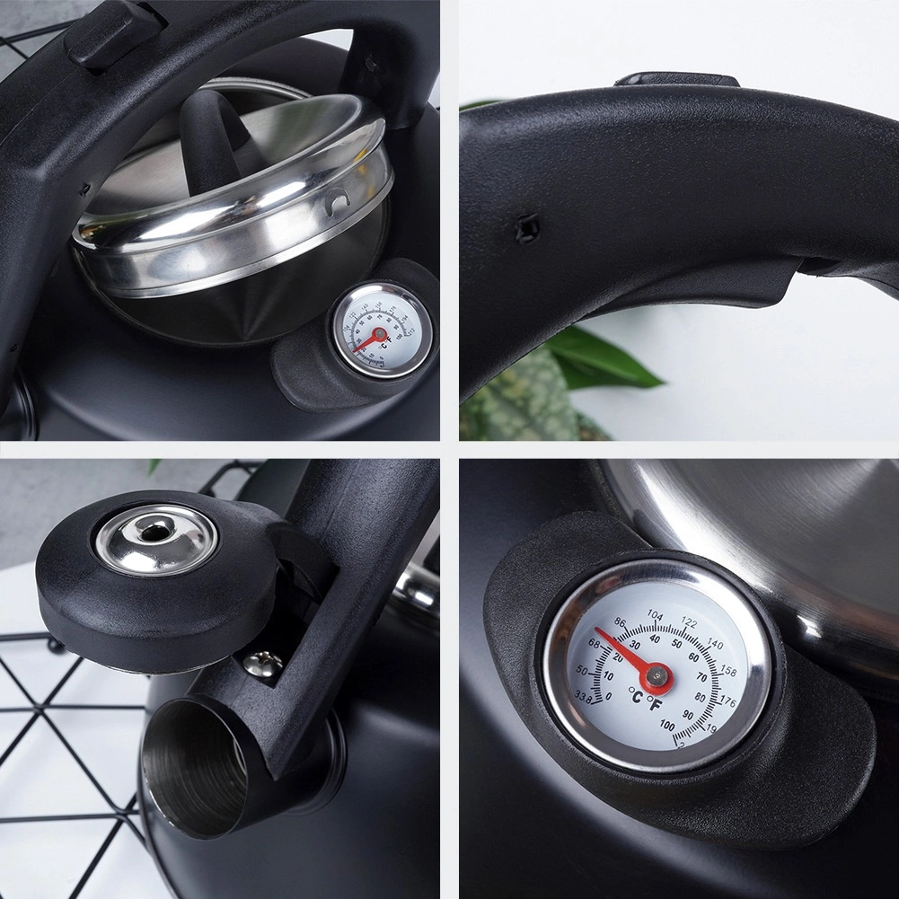 Elegantná kanvica s teplomerom je vyrobená z odolnej nehrdzavejúcej ocele s matne čiernou povrchovou úpravou. Vďaka širokej základni a akutermickému dnu sa voda ohrieva rýchlo a úsporne, zatiaľ čo čitateľný teplomer (0–100 °C / 33,8–212 °F) umožní pripraviť nápoje pri ideálnej teplote. Praktická píšťalka sa otvára tlačidlom v rukoväti pre bezpečné a pohodlné nalievanie.