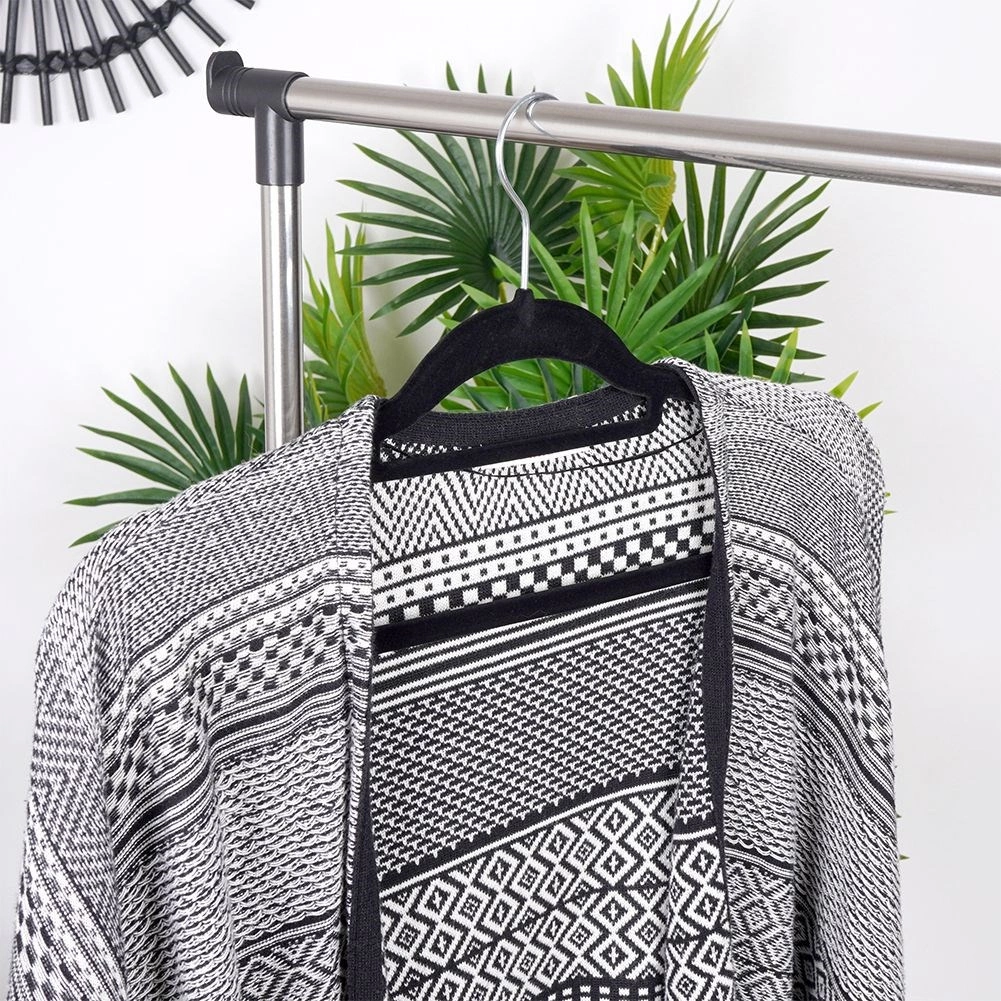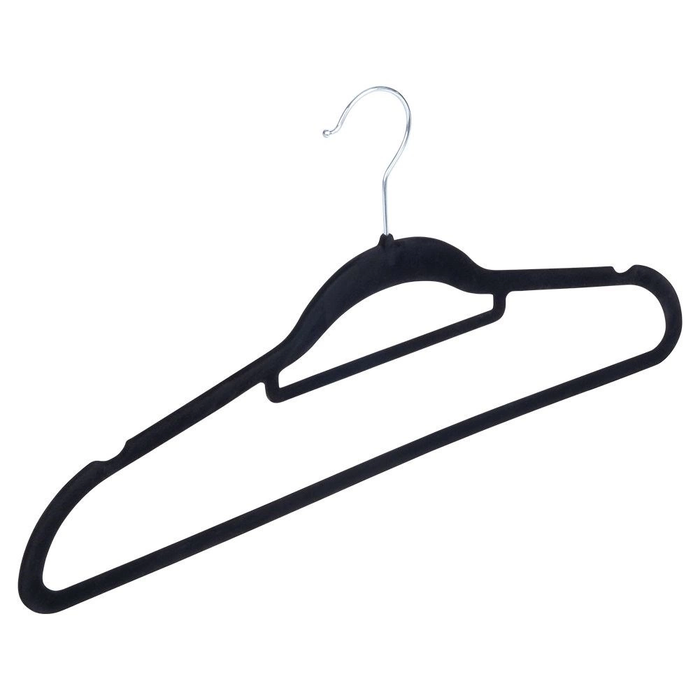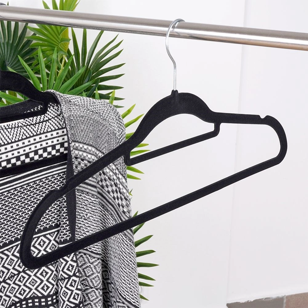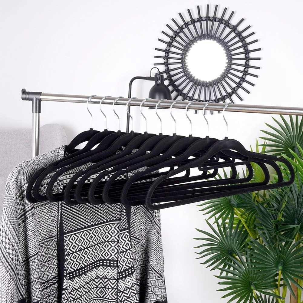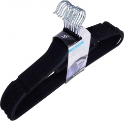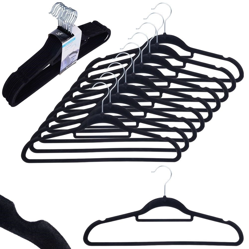 Praktická sada 10 tenkých vešiakov s jemným zamatovým povrchom pomáha udržať skriňu prehľadnú a šetrí miesto. Protišmyková úprava drží odevy bezpečne na mieste, zatiaľ čo otočný kovový háčik uľahčuje zavesenie v akomkoľvek smere.