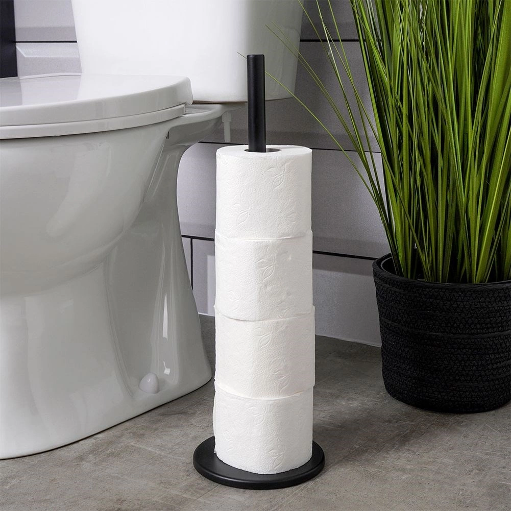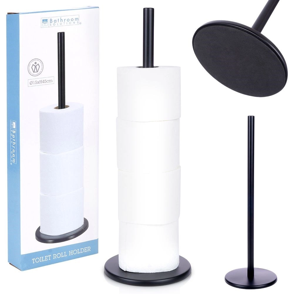 Elegantný stojan na toaletný papier z čiernej nehrdzavejúcej ocele pojme až 5 roliek a vďaka stabilnému kruhovému podstavcu sa hodí aj do menších kúpeľní. Je odolný, priestorovo úsporný a nevyžaduje vŕtanie – skvelá voľba pre moderné aj klasické interiéry.