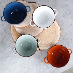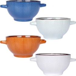 Misky v harmonických farbách (biela, modrá, oranžová/svetlo hnedá a sivá) majú štýlový rybí/chevron reliéf a kontrastný okraj, vďaka čomu skvele vyzerajú na každom stole. Sú perfektné nielen na polievky a krémy, ale aj na cereálie, jogurt, ovocie, šaláty alebo slané aj sladké snacky.