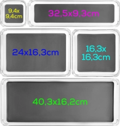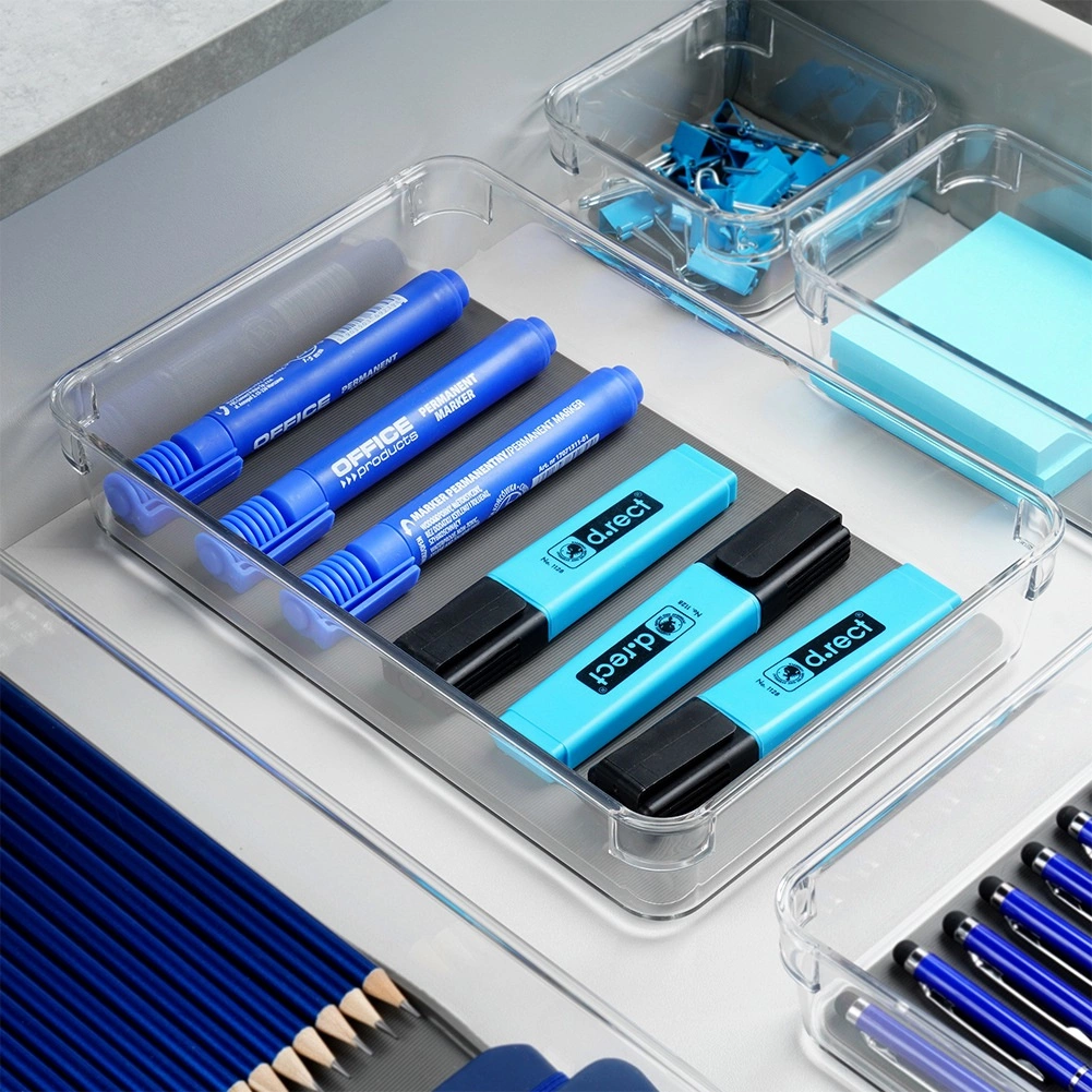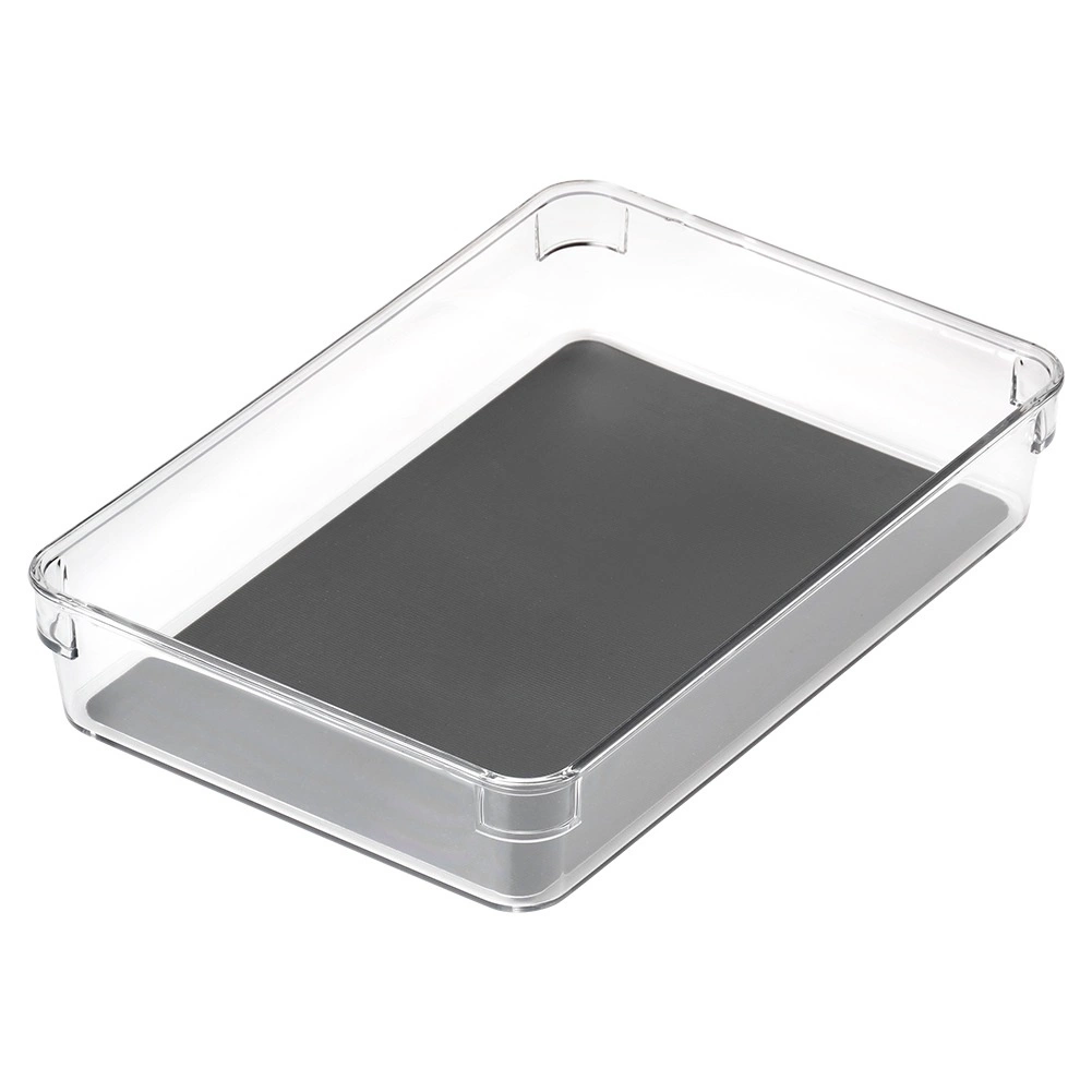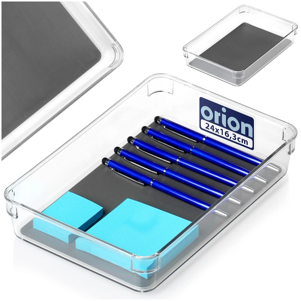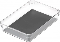 Praktický a univerzálny organizér do zásuvky či skrinky na prehľadné uloženie kuchynských, kancelárskych aj kozmetických potrieb. Má priehľadné steny pre ľahkú orientáciu, vo vnútri vyberateľnú sivú gumovú podložku a spodné protišmykové nožičky, ktoré držia zásobník pevne na mieste. Vďaka rozmerom 24 × 16 × 4,5 cm skvele pasuje do väčšiny zásuviek a pomáha udržať poriadok bez posúvania uložených vecí.