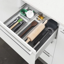 Usporiadajte si zásuvky a poličky rýchlo a efektívne. Priehľadné steny poskytujú okamžitý prehľad o obsahu, zatiaľ čo sivá TPR vložka bráni kĺzaniu predmetov. Organizér je odolný, stabilný a vďaka kompaktnej šírke skvele pasuje aj do úzkych miest.