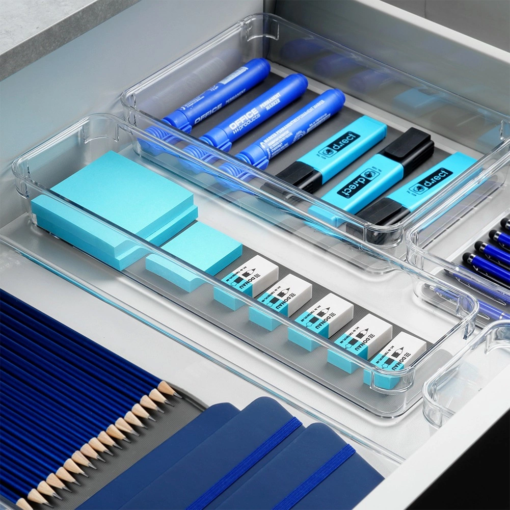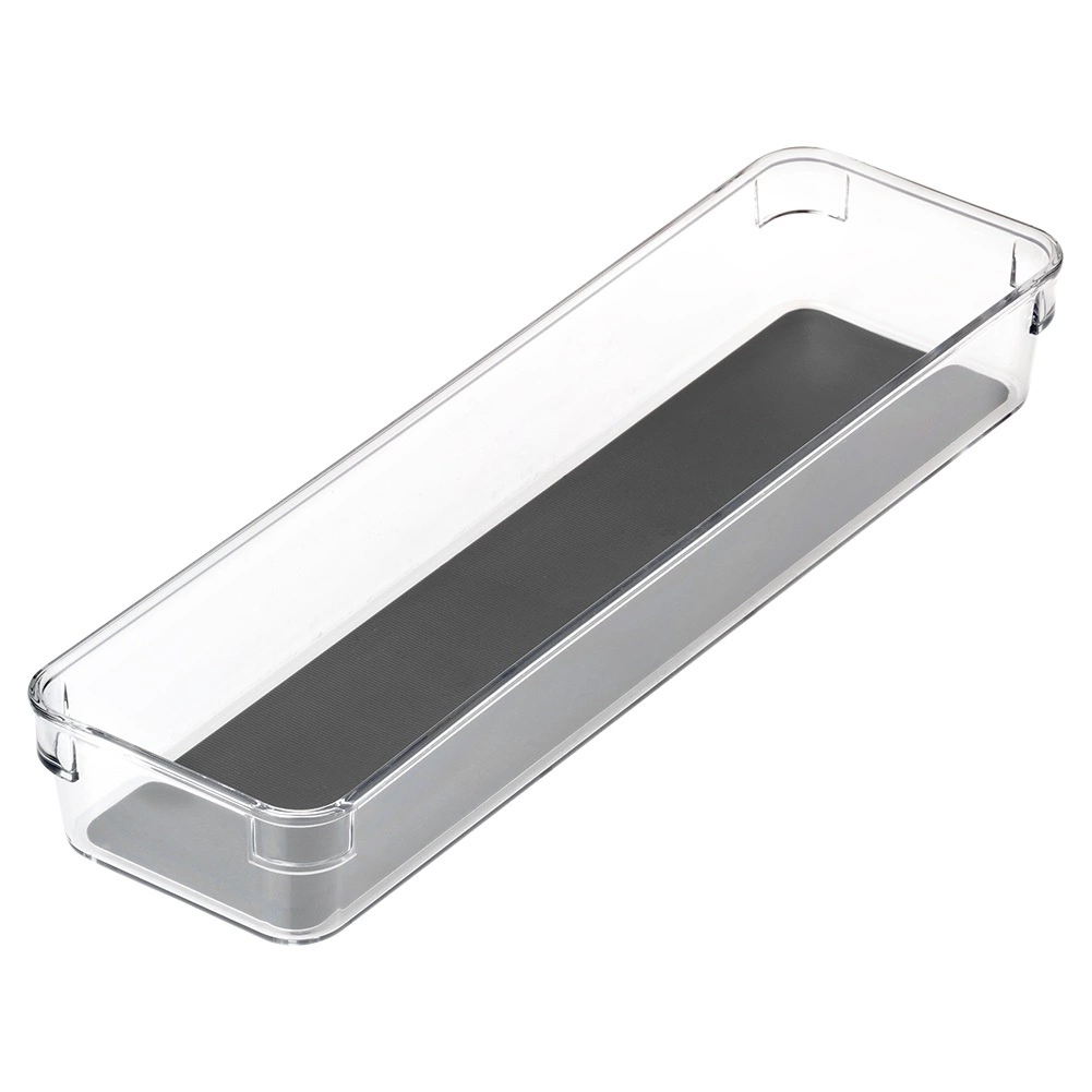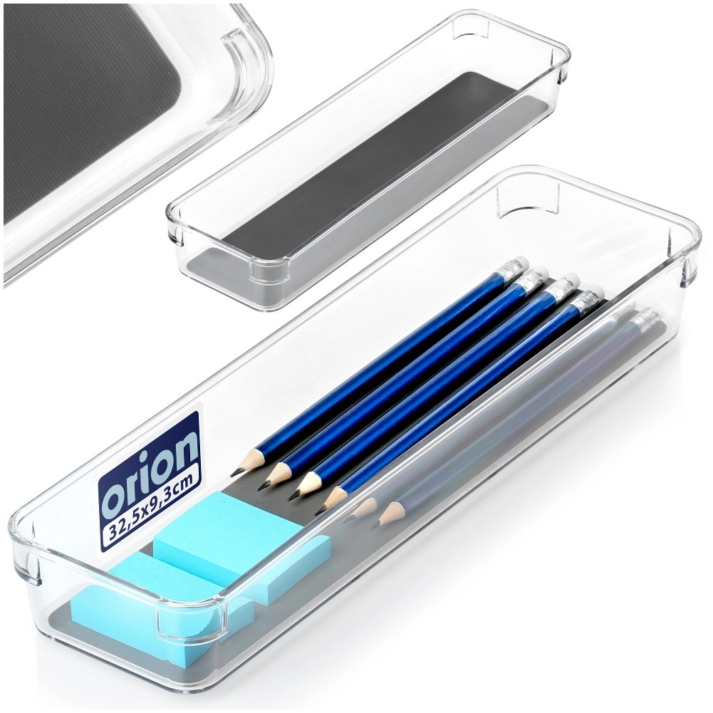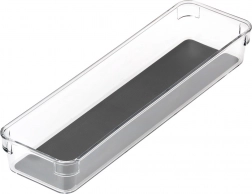 Praktický a univerzálny zásuvkový organizér z priehľadného plastu so sivou gumovou vložkou udržiava poriadok v kuchyni, kancelárii aj kúpeľni. Vďaka rozmerom 32,5 × 9 × 4,5 cm sa zmestí do väčšiny zásuviek a skriniek. Odolné prevedenie, protišmykové nožičky a ľahko umývateľná vyberateľná vložka zaistia stabilitu aj prehľadnosť uložených predmetov. Ideálny na príbory, písacie potreby, kozmetiku aj drobnosti v dielni či chladničke.