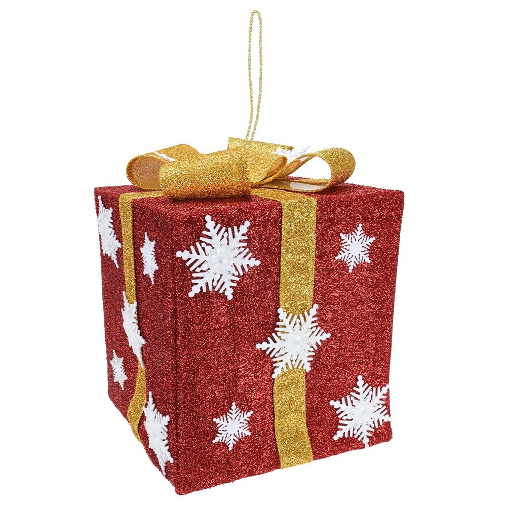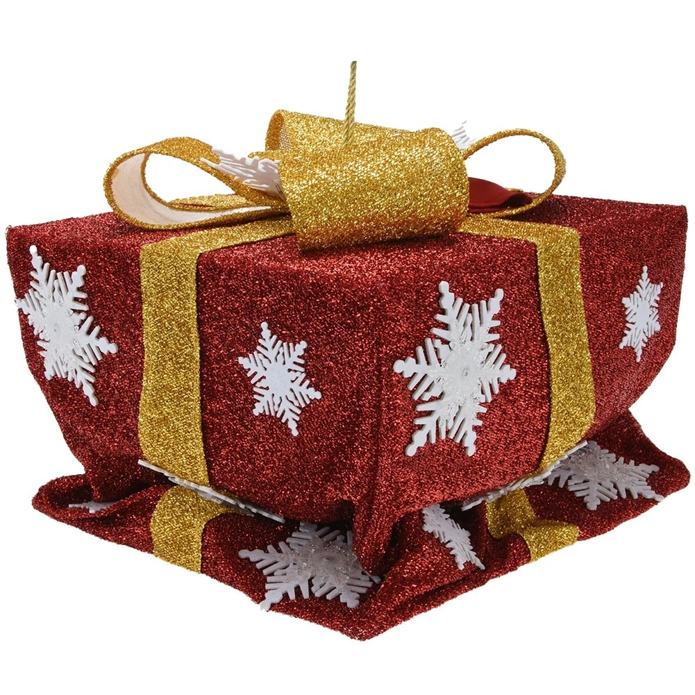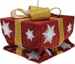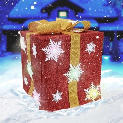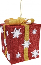 Vytvorte si doma aj na záhrade dokonalú sviatočnú atmosféru so svietiacim darčekom v sýto červenej farbe, zdobeným bielymi snehovými vločkami a zlatou mašľou. Integrované LED diódy (14 ks) s farebnou premenou rozžiaria dekoráciu jemným, atraktívnym svetlom. Vďaka skladacej konštrukcii z kovu s dekoratívnym povrchom je ozdoba robustná a zároveň ľahko uskladniteľná.