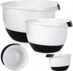 Univerzálna sada kuchynských mís v bielej farbe s čiernymi, protišmykovými dnými pre maximálnu stabilitu na pracovnej doske. Vďaka integrovaným úchytom a výlevke je nalievanie ciest či omáčok čisté a presné. Misy sa ľahko udržiavajú, sú ľahučké a zároveň odolné, takže sa hodia na každodenné varenie aj pečenie.