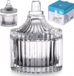 Štýlová sklenená cukornička s vekom v kompaktných rozmeroch 6,5 × 9 cm a objeme 80 ml je skvelou voľbou na každodenné použitie aj slávnostné príležitosti. Rebrované zdobenie dodáva nádych vintage elegancie a priehľadné sklo umožňuje kontrolu obsahu.