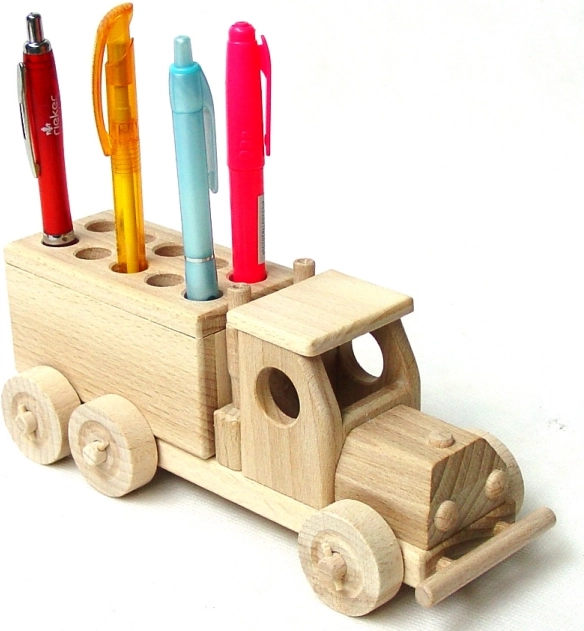 Vneste poriadok na stôl detí aj dospelých s originálnym stojančekom v tvare nákladiaka. Je vyrobený z prvotriedneho bukového dreva, jeho povrch je iba voskovaný a leštený bez chemických úprav a farbenia – vďaka tomu si zachováva prírodný vzhľad aj vôňu dreva. Otočné kolieska a zaoblené hrany zaisťujú bezpečné a zábavné používanie.