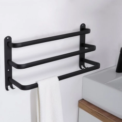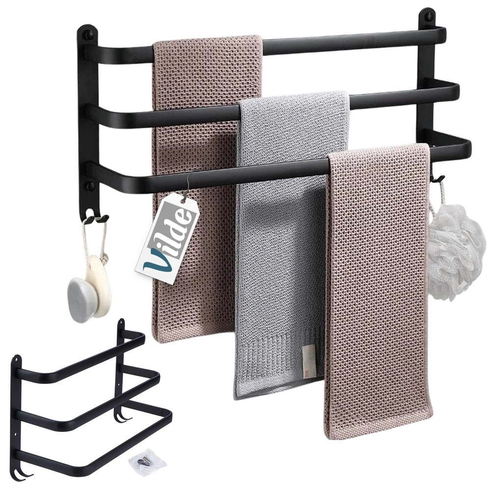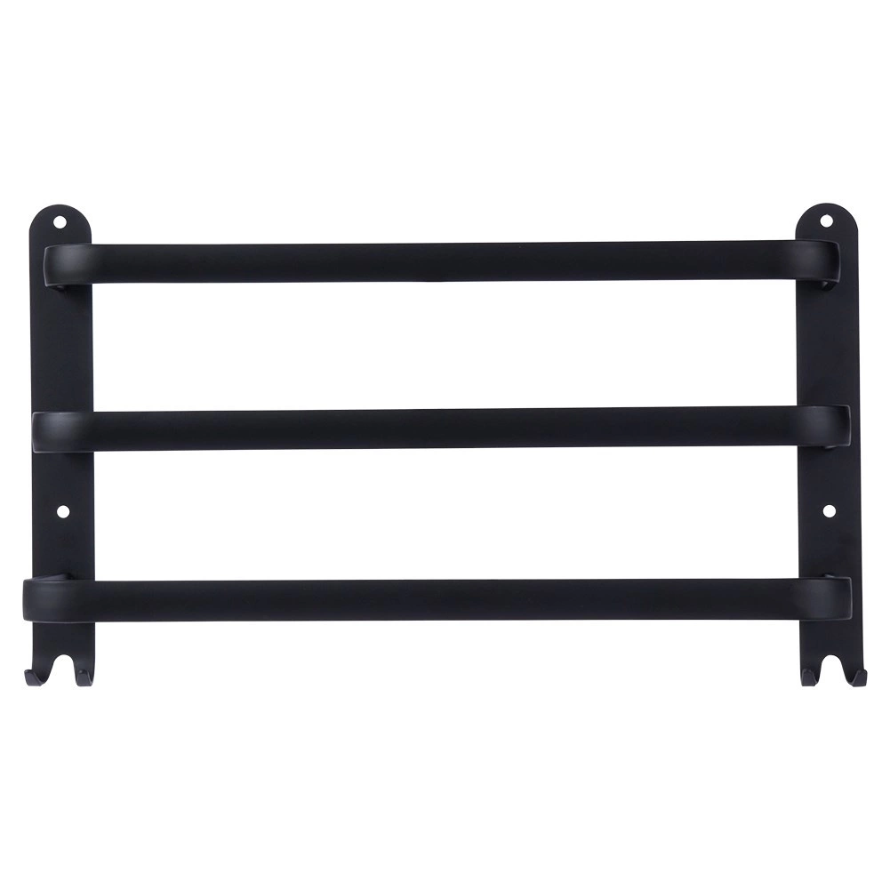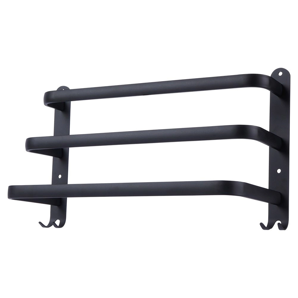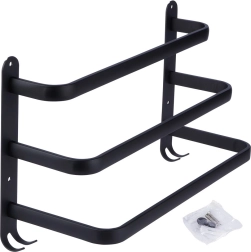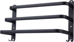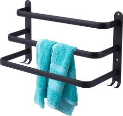 Štýlový a odolný držiak na uteráky pre prehľadnú organizáciu vašej kúpeľne. Tri horizontálne tyče umožňujú efektívne sušenie a vetranie uterákov, zatiaľ čo štyri háčiky v spodnej časti poskytnú miesto pre žinky či doplnky. Minimalistický dizajn v matnej čiernej podčiarkne charakter interiérov v škandinávskom, modernom aj loftovom štýle.