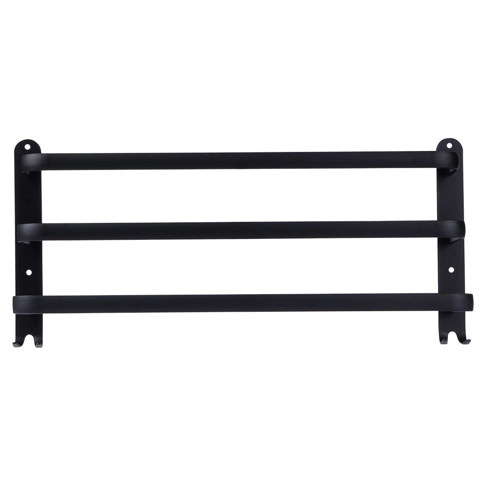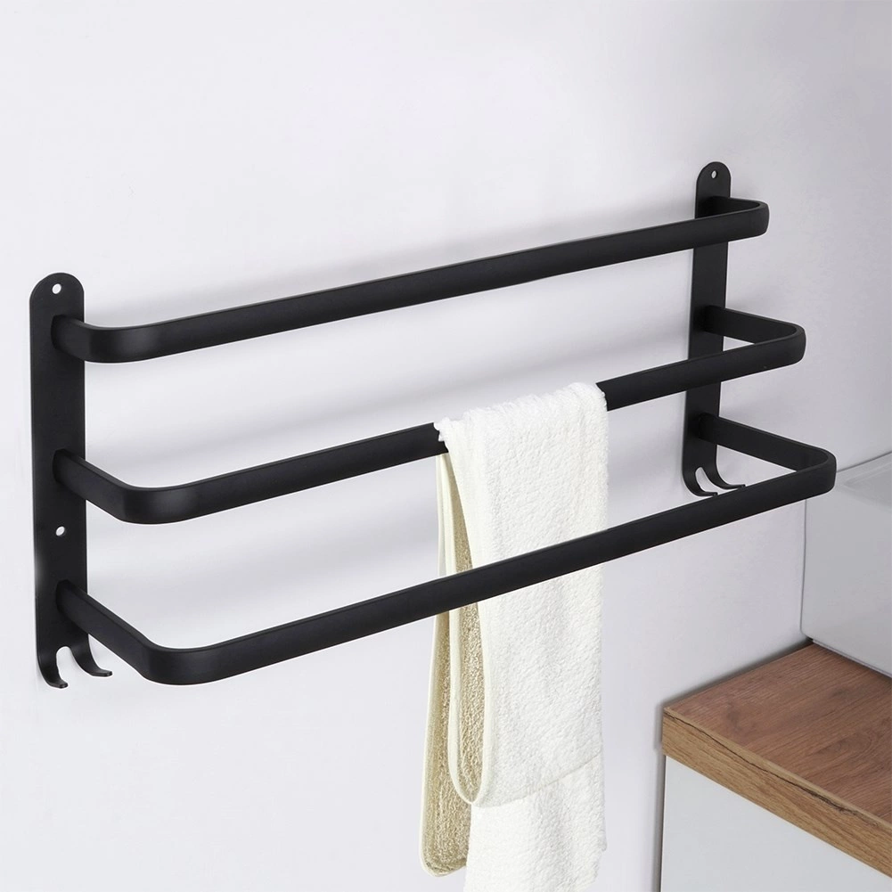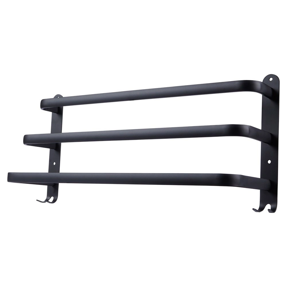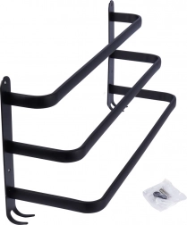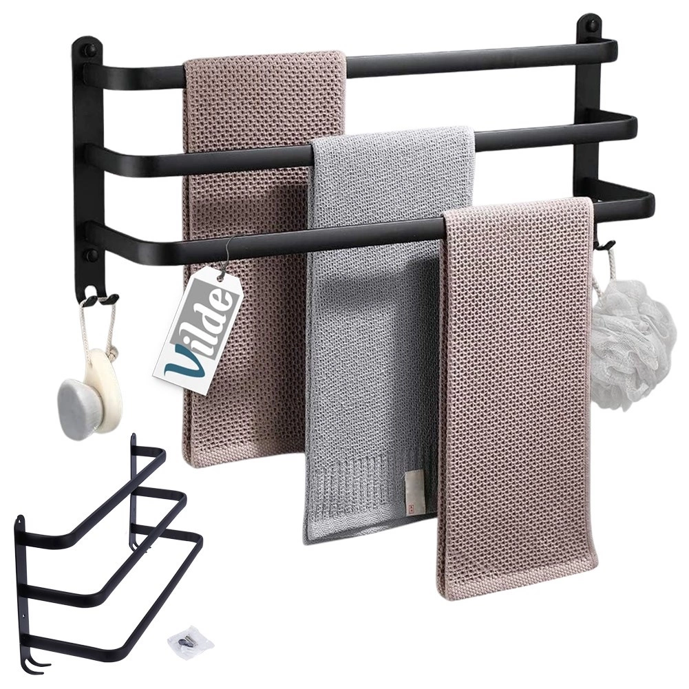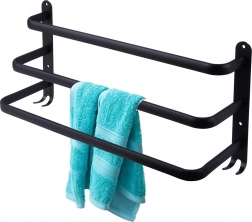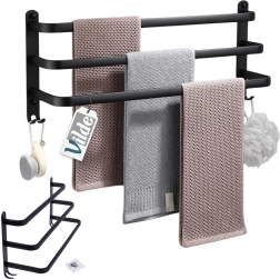Maximalizujte priestor vo svojej kúpeľni s praktickým držiakom na uteráky s dĺžkou 50 cm. Robustná hliníková konštrukcia s matným čiernym povrchom je odolná voči vlhkosti a zároveň štýlová. Tri samostatné tyče umožnia lepšiu cirkuláciu vzduchu a rýchlejšie schnutie, zatiaľ čo štyri spodné háčiky poskytnú miesto pre žinky, hubky alebo kefy.