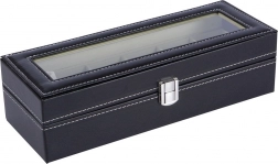 Toto štýlové puzdro na hodinky spája praktickosť a reprezentatívny vzhľad. Čierna eko koža s bielym stehom a sklenené veko umožňujú jednoduchú kontrolu obsahu bez otvárania. Krémová, na dotyk príjemná výstelka bezpečne drží hodinky a krásne ich zvýrazní.