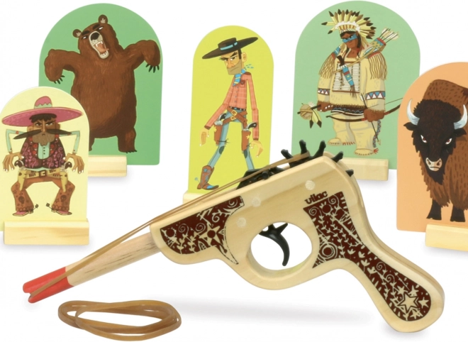 Drevená westernová pištoľ s terčmi VILAC prináša bezpečnú a zábavnú formu súťaženia. Deti si hravou formou rozvíjajú koordináciu ruky a oka, učia sa sústrediť a precvičujú trpezlivosť. Jednoduchý mechanizmus na gumičku je ľahký na ovládanie a vhodný pre malé deti.
