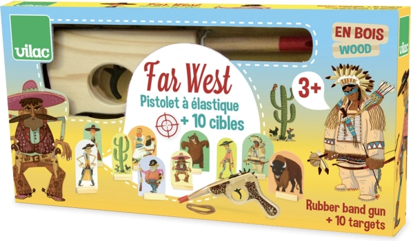 Zažite atmosféru Divokého západu s touto drevenou pištoľou s terčmi od značky VILAC. Hra je ideálna pre deti od 3 rokov a pomáha trénovať presnosť, sústredenie a jemnú motoriku. Stačí natiahnuť gumičku, postaviť terče a začať strieľať – zábava pre celú rodinu.