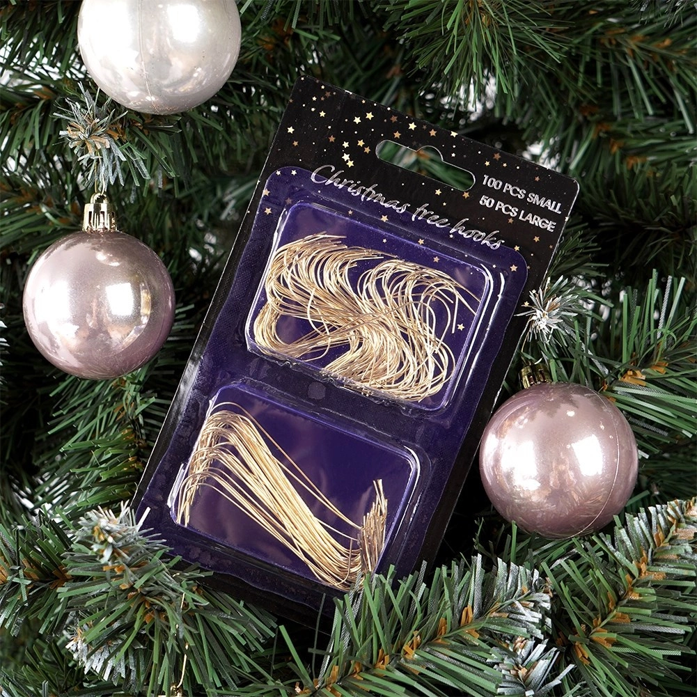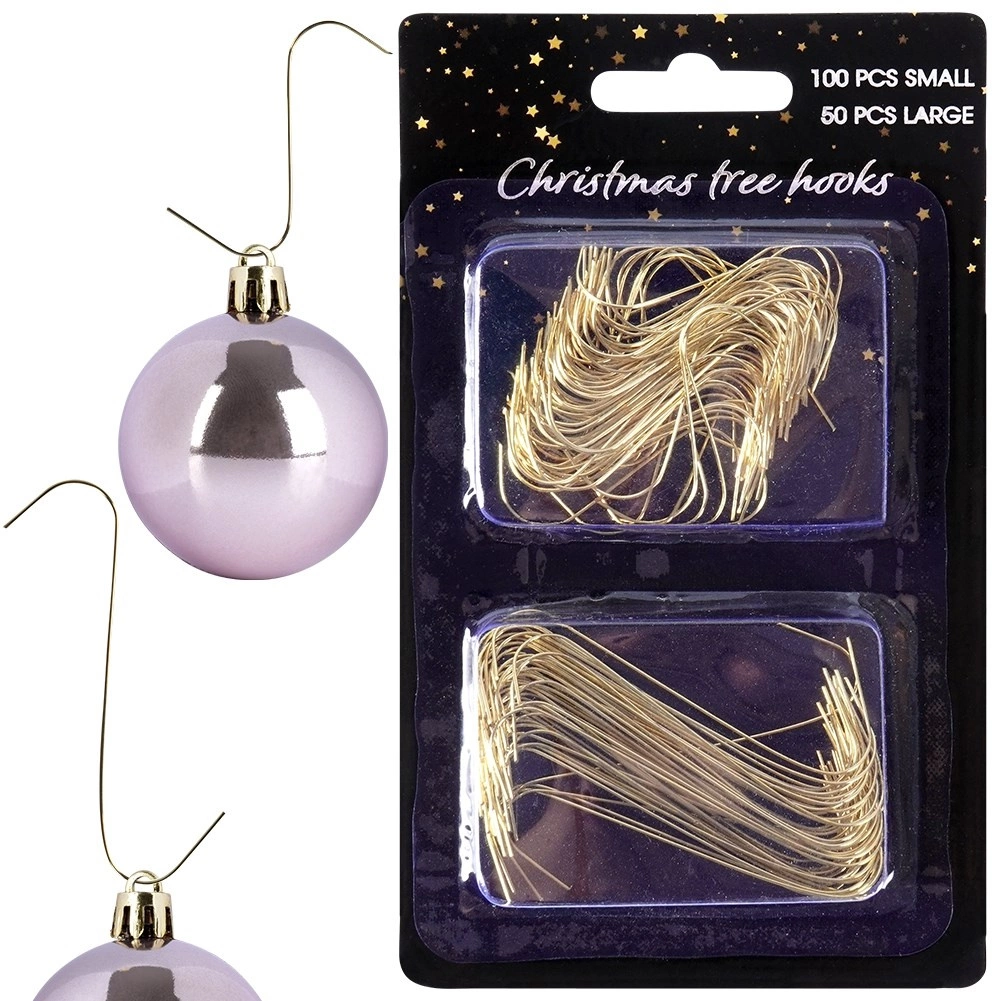 Praktická sada 150 zlatých háčikov na zavesenie vianočných ozdôb a gúľ na stromček. Obsahuje 100 menších (4 cm) a 50 väčších (6 cm) háčikov, ktoré sú pevné, viackrát použiteľné a vďaka ergonomickému tvaru umožňujú rýchle a bezpečné zavesenie aj deťom.