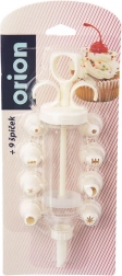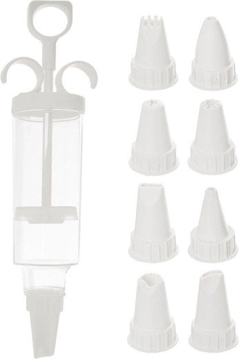 Praktická sada na zdobenie tort, zákuskov a jednohubiek s 9 vymeniteľnými špičkami a presným piestovým dávkovaním. Odolné prevedenie z kvalitného plastu, priehľadné telo pre kontrolu množstva krému a ľahké používanie aj čistenie. Ideálne na krémy, šľahačku aj náplne.