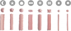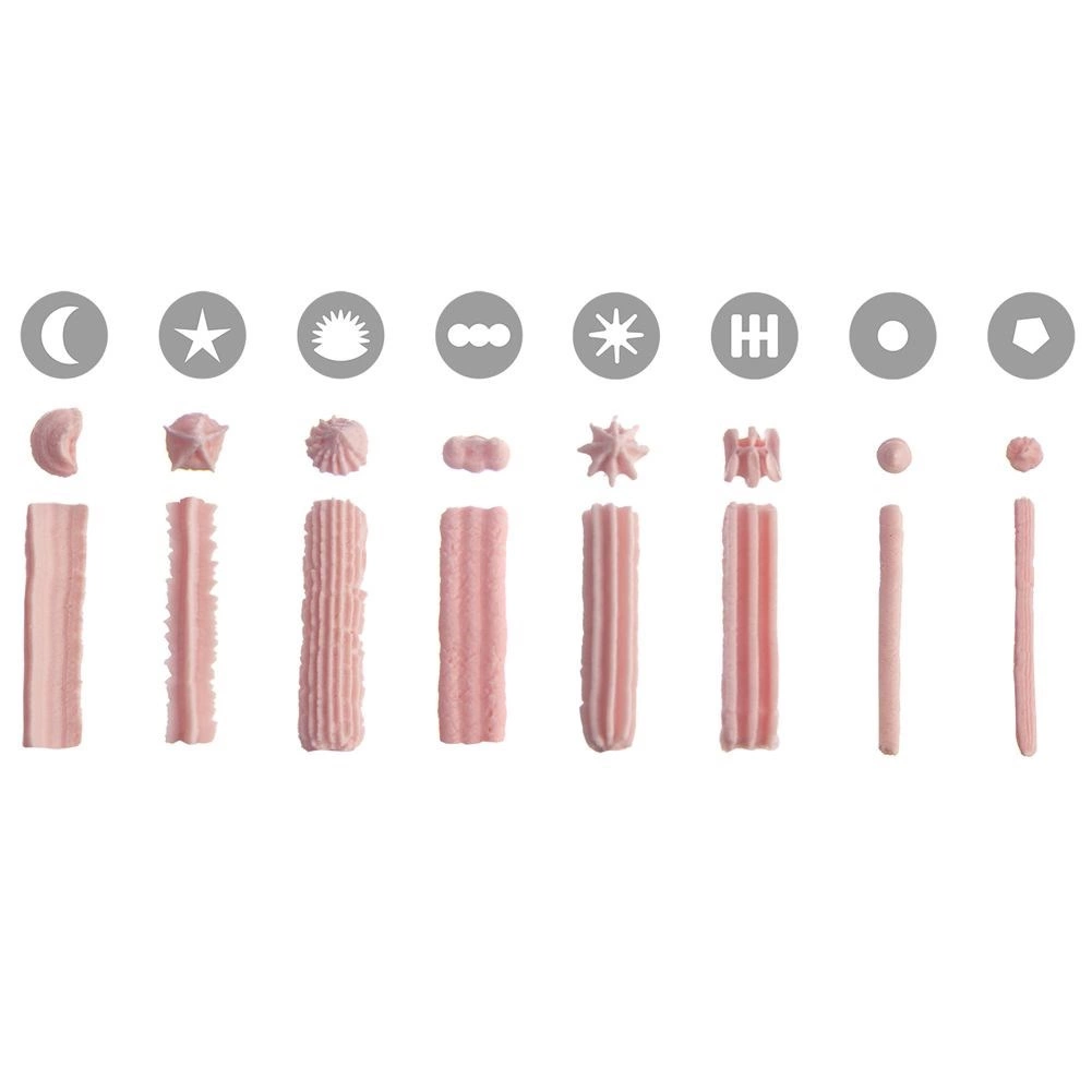- 9 vymeniteľných špičiek pre rôzne vzory – linky, hviezdičky, kvety, vlnky aj plnenie.