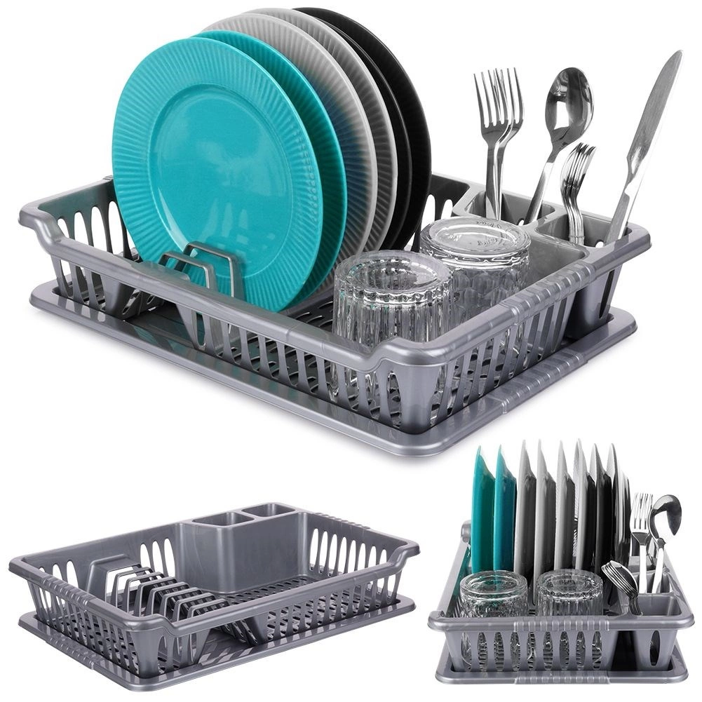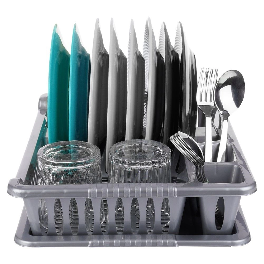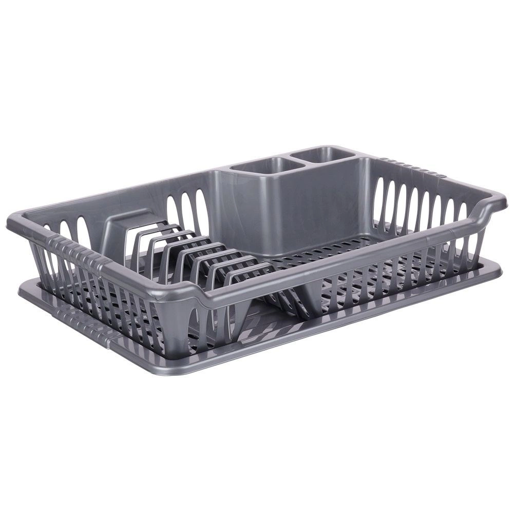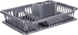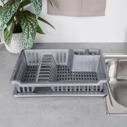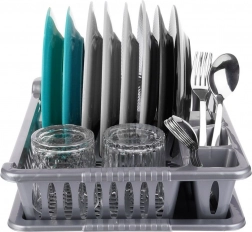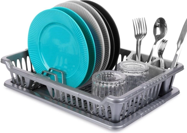 Praktický sivý odkvapkávač na riad s rozmermi 40 × 29 × 8,5 cm udrží kuchynskú linku suchú a riad prehľadne usporiadaný. Má vyberateľnú odkvapkávaciu tácku, miesta na taniere, hrnčeky aj príbory a je vyrobený z kvalitného plastu bez BPA. Ideálny na každodenné používanie, ľahko sa čistí a hodí sa do moderných aj klasických kuchýň. Bez BPA, odnímateľná tácka, priestor pre 8 tanierov, praktické priehradky na príbory.