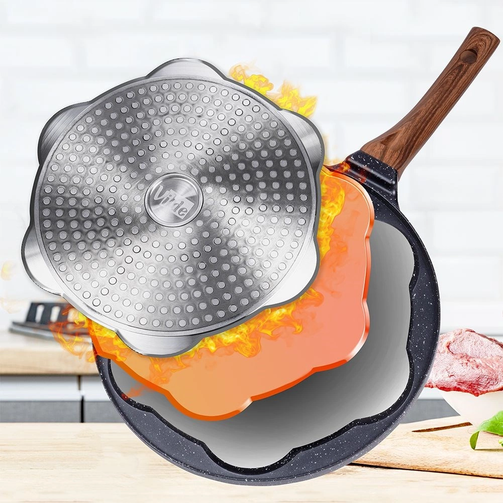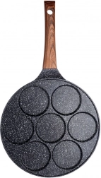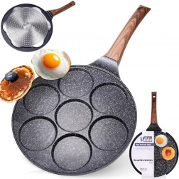 Univerzálna panvica na vajcia a lievance so 7 kruhovými formami s priemerom 8 cm zaistí dokonalý tvar a rovnomerné prepečenie. Odolné hliníkové telo s nepriľnavým granitovým povrchom umožní variť s minimom tuku, ergonomická rukoväť s imitáciou dreva je pohodlná a bezpečná. Vďaka rovnomernému rozvodu tepla šetrí čas aj energiu a je vhodná na plyn, elektrinu, keramiku, halogén aj indukciu.