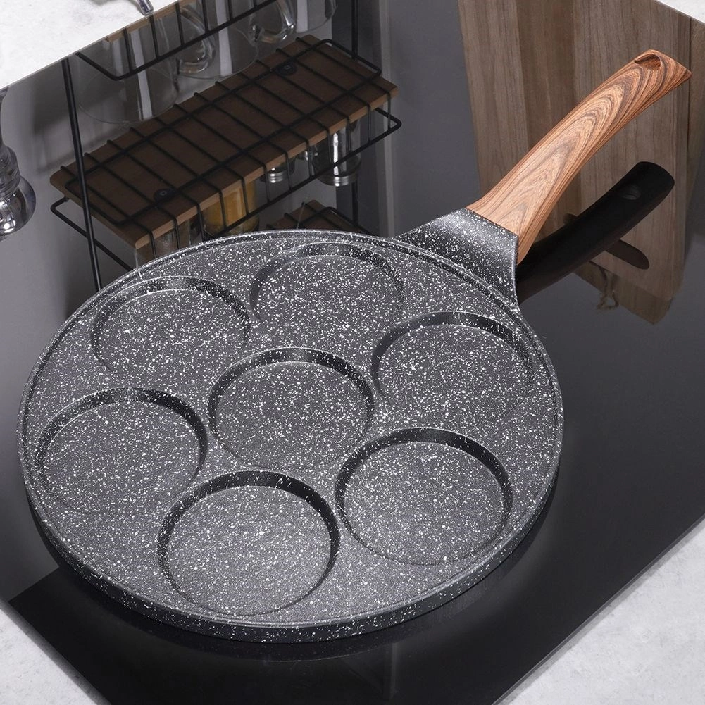 Pripravte si dokonale guľaté volské oká, lievance alebo mini palacinky – táto panvica so 7 priehlbinami vám uľahčí každé raňajkové menu. Granitová nepriľnavá vrstva v čierno–sivom „stone“ vzhľade zabraňuje pripáleniu a umožňuje zdravšie varenie s minimom oleja. Štýlová kombinácia BLACK&WOOD skvele zapadne do modernej kuchyne.
