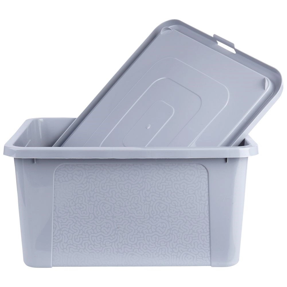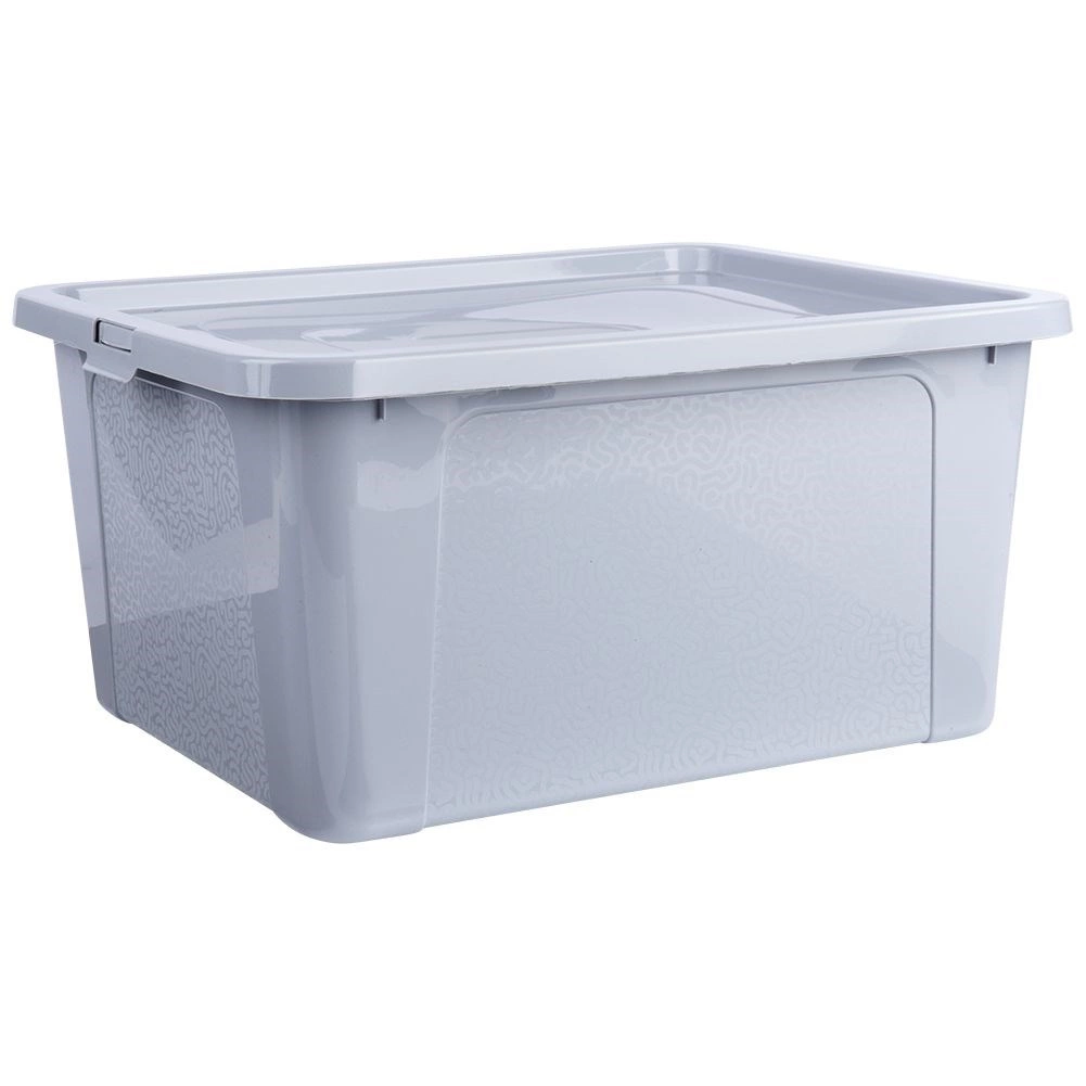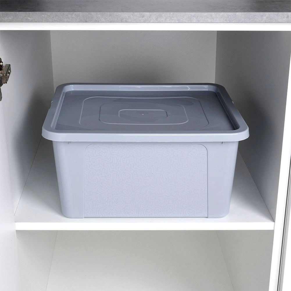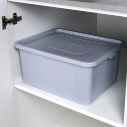 Praktický úložný box s vekom s objemom 20 l pomôže udržať poriadok v domácnosti, kancelárii aj dielni. Je vyrobený z odolného plastu v svetlosivej farbe, je ľahký, stohovateľný a vďaka zaobleným rohom sa s ním bezpečne manipuluje. Veko sa zatvára na zacvaknutie a chráni obsah pred prachom a vlhkosťou. Ideálny na hračky, textil, oblečenie, kuchynské doplnky či náradie. Rozmery: 40 × 33 × 20 cm, objem 20 l.