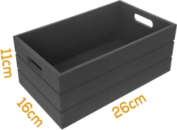 Praktická drevená debnička v elegantnej čiernej farbe pomôže udržať poriadok v každej miestnosti. Je vyrobená z odolného dreva, má integrované úchyty na jednoduché prenášanie a kompaktné rozmery 26 × 16 × 11 cm. Skvele sa hodí na kozmetiku, kancelárske potreby, koreniny, kuchynské pomôcky aj drobné oblečenie. Univerzálna, odolná a dekoratívna – dokonale zapadne do klasického aj moderného interiéru.