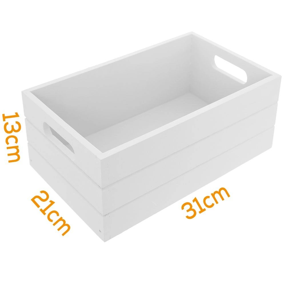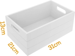 Praktická drevená debnička v bielej farbe na prehľadné ukladanie vecí v domácnosti aj kancelárii. Má kompaktné rozmery 31 × 21 × 13 cm, integrované madlá na ľahké prenášanie a pevnú, stabilnú konštrukciu. Skvele sa hodí na kozmetiku, papiernictvo, koreniny, kuchynské potreby či drobné oblečenie. Vďaka čistému dizajnu poslúži tiež ako dekoratívny prvok alebo organizér do políc, komôd a na pracovný stôl.