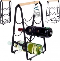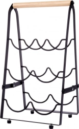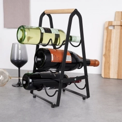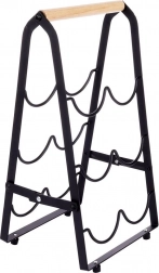 Elegantný a stabilný stojan na víno pre až 6 fliaš v modernej čiernej farbe s drevenou rukoväťou. Vďaka horizontálnemu uloženiu fliaš udržuje korky vlhké a zabezpečuje správne zrenie vína. Robustná kovová konštrukcia, protišmykové nožičky a kompaktné rozmery 21 × 17 × 38 cm z neho robia praktický doplnok do kuchyne, jedálne aj domáceho baru. Skladací dizajn uľahčuje prenášanie aj odkladanie.