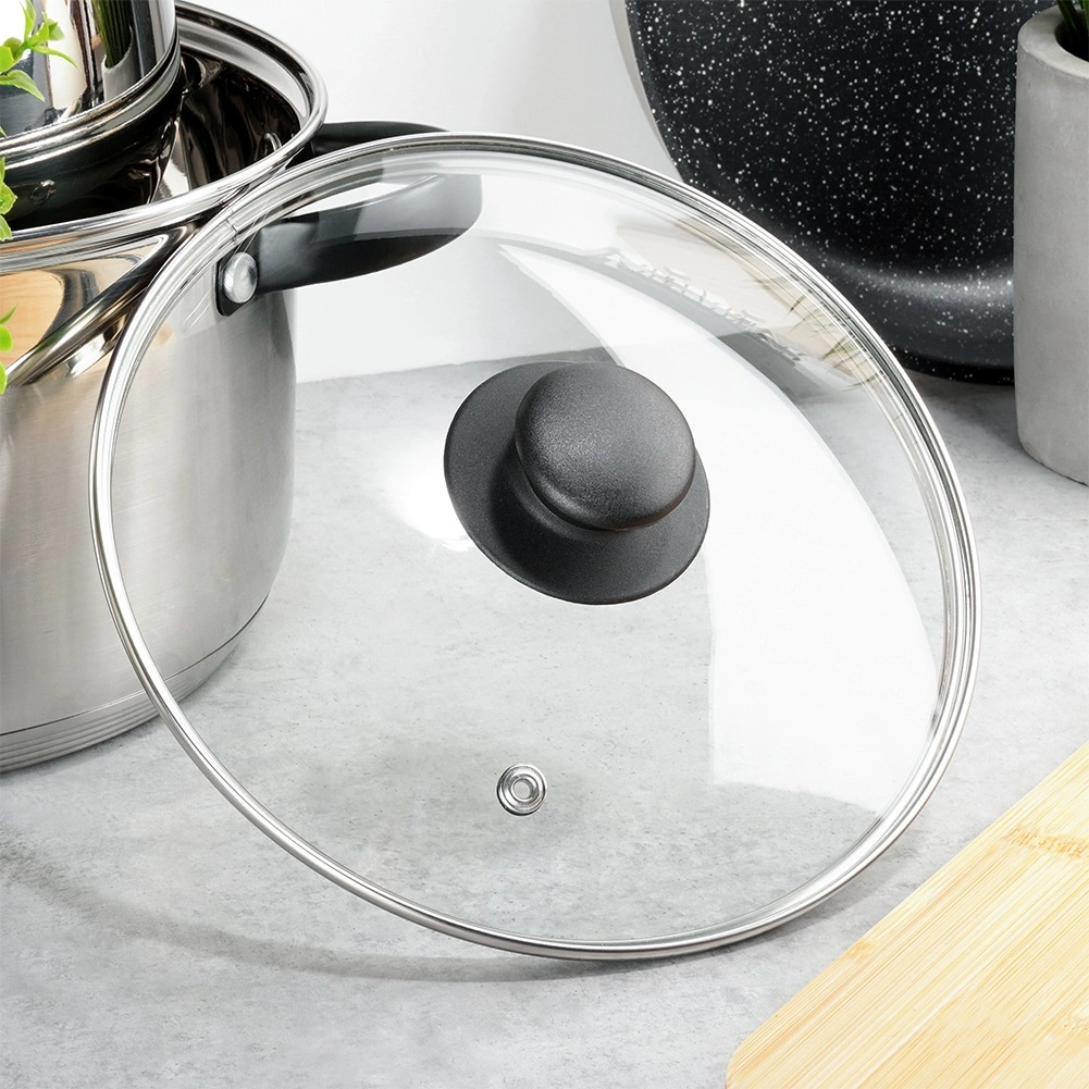 Nerezový okraj zvyšuje odolnosť hrany a tesnosť, zatiaľ čo tepelne odolný plastový gombík zabezpečuje istý a pohodlný úchop.