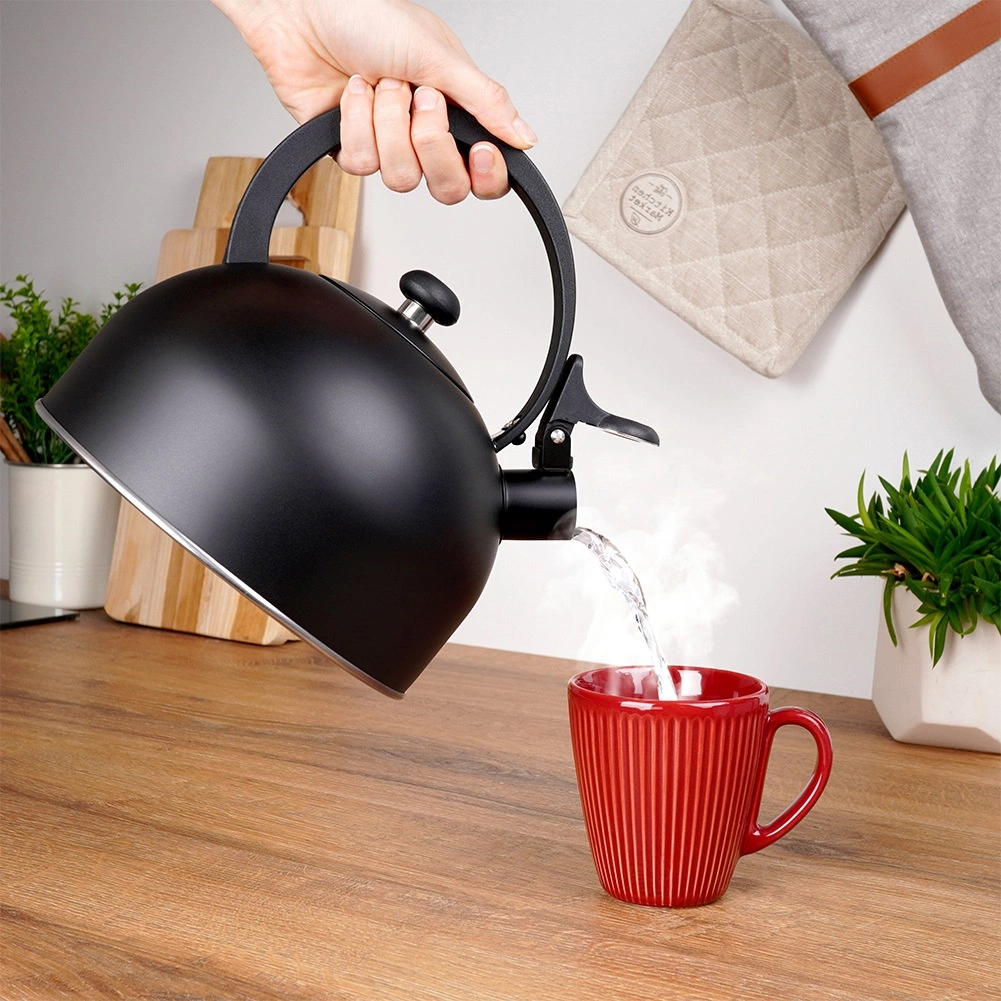 Ergonomické, tepelne odolné madlo a sklopná píšťalka umožnia komfortné a kontrolované nalievanie bez rizika popálenia.