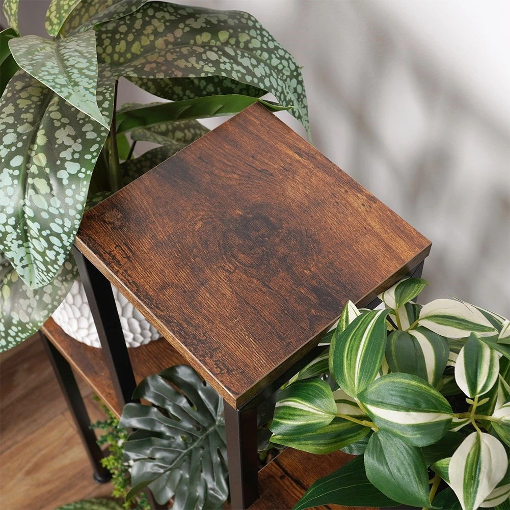 Robustný kovový rám v čiernej farbe a kvalitné MDF dosky v tmavom drevodekore tvoria odolnú a stabilnú konštrukciu. Stojan je vhodný pre živé aj umelé rastliny, hodí sa do moderných aj industriálnych interiérov a vďaka jednoduchej údržbe bude vždy vyzerať skvelo.