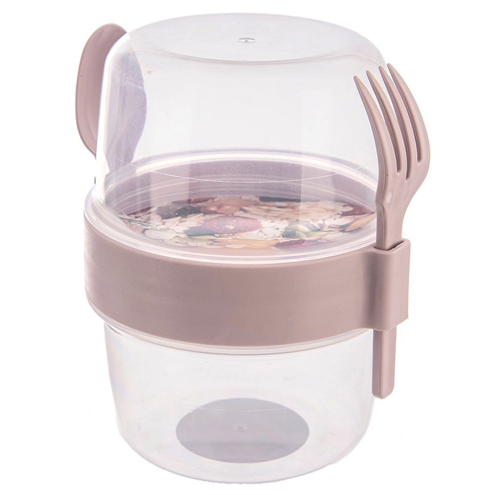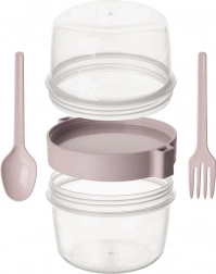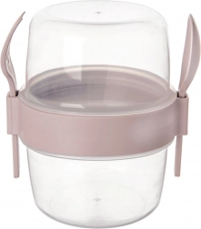 Praktický dvojposchodový pohár na jogurt s miskou na müsli s objemom 370 ml je ideálny na cesty, do práce aj do školy. Vďaka tesnému viečku, samostatnému oddielu na toppings a priloženej lyžičke aj vidličke budete mať svoju desiatu vždy pripravenú a čerstvú. Vyrobený z odolného plastu bez BPA, vhodný do umývačky riadu a bez viečka aj do mikrovlnky.