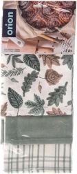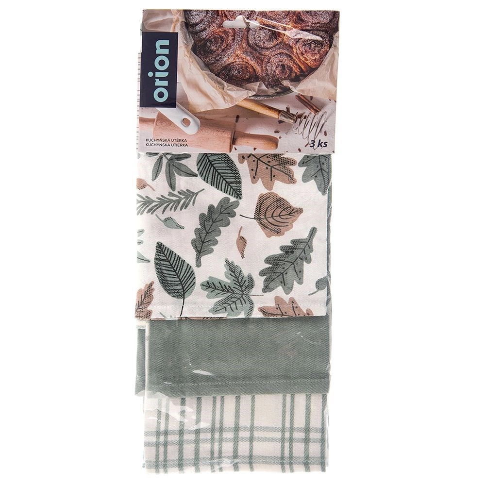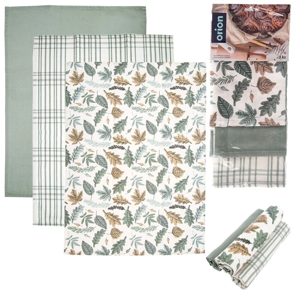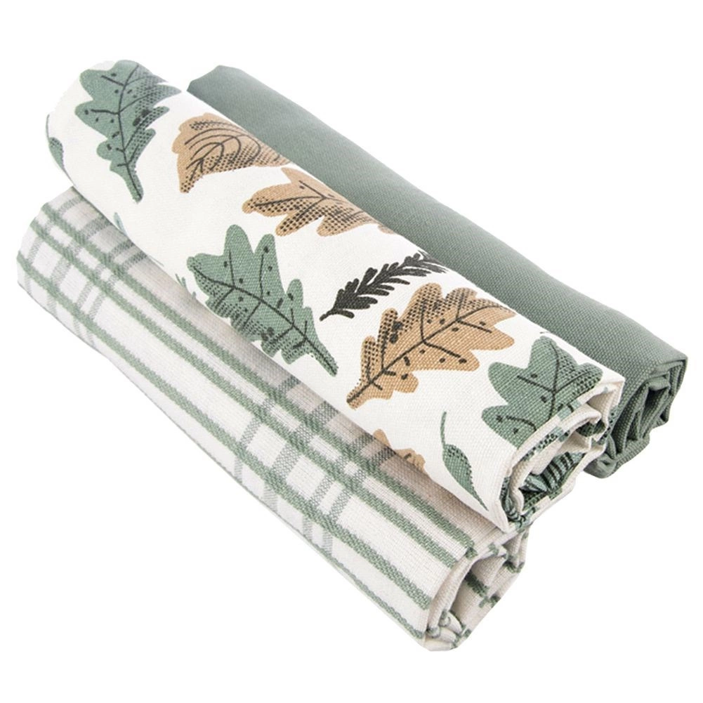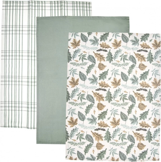 Praktická sada troch kuchynských utierok zo 100 % bavlny v odtieňoch zelenej a bielej. Každá utierka má iný motív – listový vzor, kockovaný vzor a jednofarebnú. Vďaka vysokej savosti rýchlo osuší riad aj ruky, sú odolné, príjemné na dotyk a majú skryté pútko na jednoduché zavesenie. Možno prať na 40 °C.