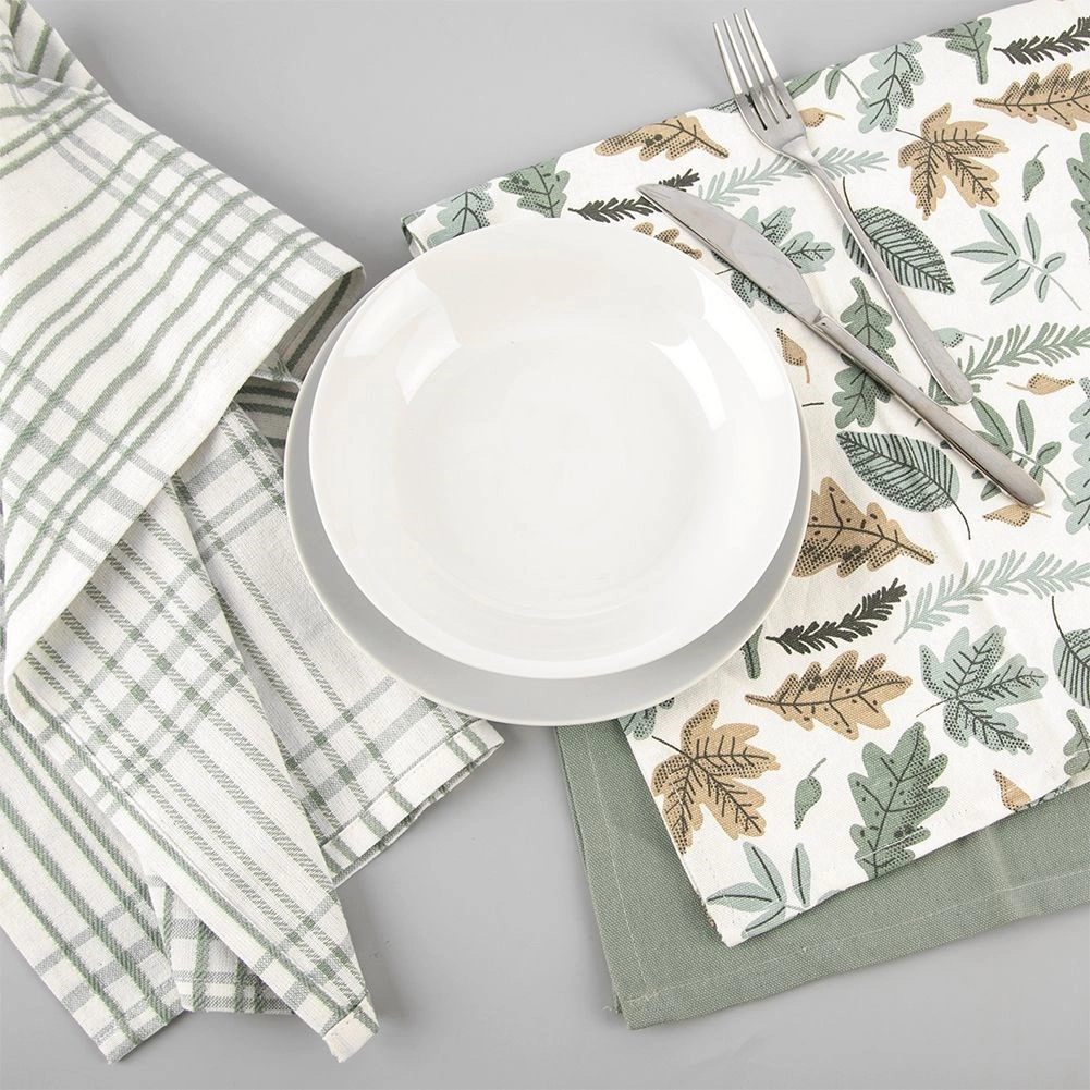 Kombinácia listového motívu, zelenej kocky a jednofarebnej utierky dodá kuchyni prírodný nádych a ľahko sa kombinuje s doplnkami.