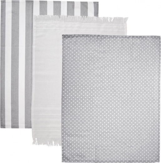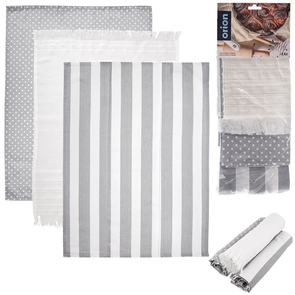 Sada 3 kvalitných bavlnených utierok v moderných vzoroch – pruhy, bodky a čisto biela s trúbkami – sa skvele hodí do každej kuchyne. Vďaka 100 % bavlne vynikajú savosťou a sú príjemné na dotyk, zároveň však ostávajú pevné a trvácne na každodenné použitie.