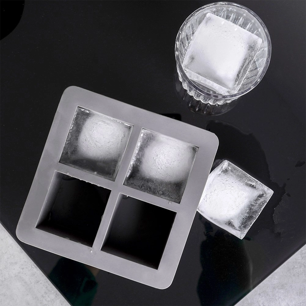 Praktická silikónová forma na ľad vytvára 4 extra veľké štvorcové kocky 5,5 × 5,5 × 5,5 cm, ktoré sa pomalšie rozpúšťajú a udržia nápoje dlhšie studené bez zbytočného riedenia. Vďaka flexibilnému silikónu sa kocky ľahko vyberajú a forma sa jednoducho čistí, vrátane umývačky riadu.