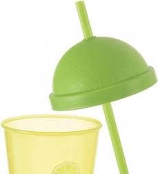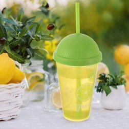 Štýlový kelímok s objemom 450 ml so zamykacím kopulovitým viečkom a opakovane použiteľnou slamkou. Ľahké a odolné prevedenie v zelenej farbe s citrusovým dekorom je ideálne na studené nápoje doma aj vonku, na pikniky či záhradné párty. Viečko obmedzuje rozliatie a bráni prenikaniu hmyzu, slamka je navrhnutá tak, aby nevypadla.