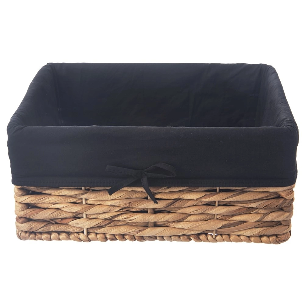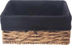 Elegantný košík na ukladanie z pleteného vodného hyacintu ponúka odolnú konštrukciu na kovovom ráme a mäkkú, prateľnú vložku v čiernej farbe s mašľou. Vďaka gume po obvode vložka perfektne sedí a chráni ako obsah, tak aj košík.