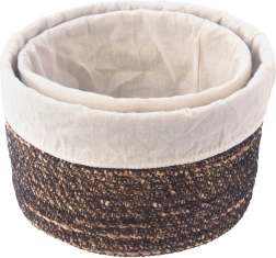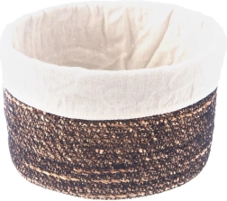Tento ručne vyrábaný okrúhly kôš (Ø 20 cm, výška 13 cm) z pevne prepleteného vodného hyacintu s dekoratívnym stehom v tmavom tóne ponúka praktické a estetické riešenie na každodenné ukladanie. Béžová textilná vložka z bavlny a polyesteru sa vďaka gume dokonale prispôsobí tvaru koša a možno ju prať do 30 °C.
