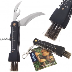 Praktický hubársky nôž so skladacou čepeľou z nehrdzavejúcej ocele a čiernou drevenou rukoväťou ponúka integrovanú kefku, mierku 1–5 cm, otvárač na fľaše aj vývrtku. Kompaktné rozmery po zložení 11,5 × 2,5 × 1,5 cm z neho robia ideálneho spoločníka na zber a čistenie húb aj výlety do prírody.