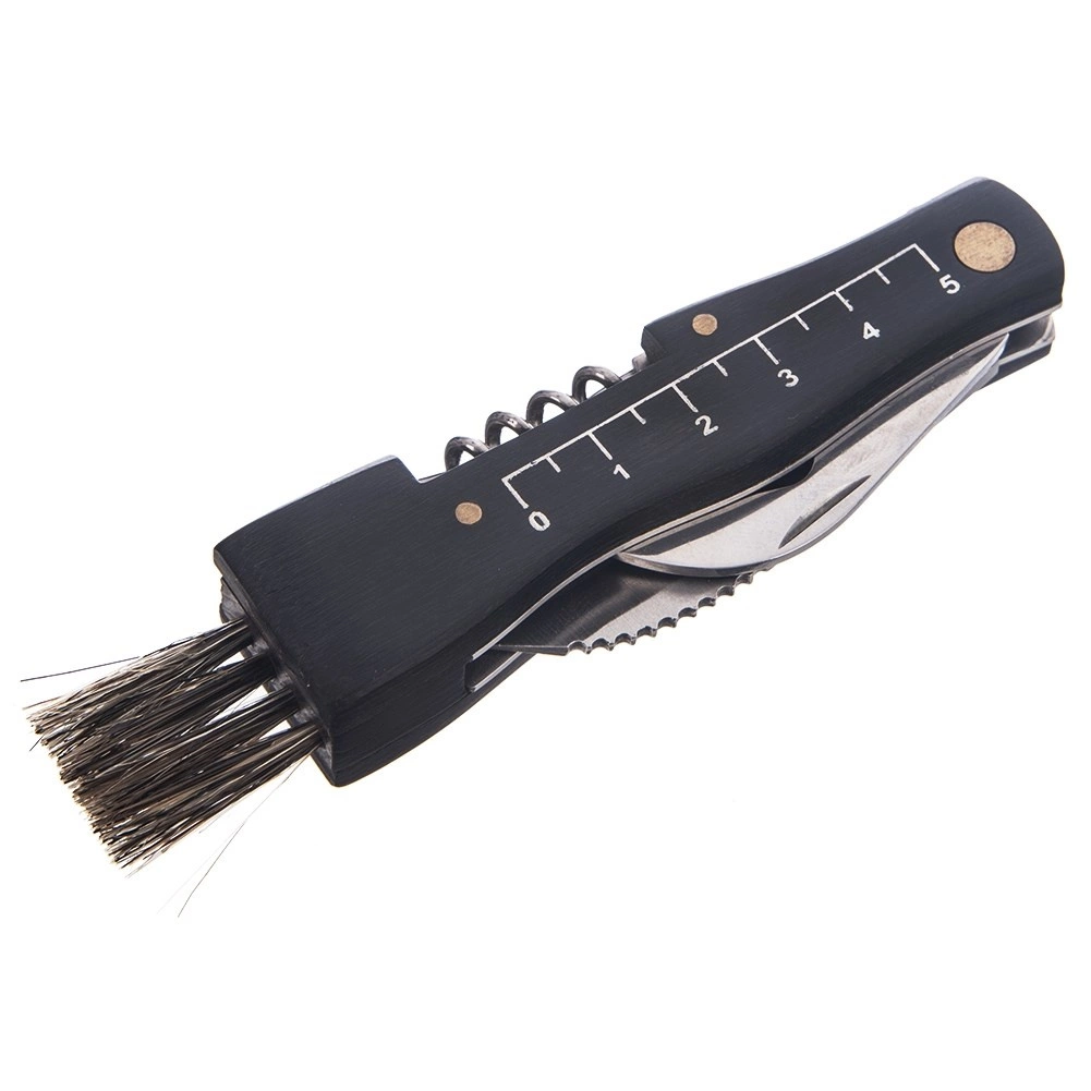 - Skládacia čepeľ, kefka na čistenie húb, mierka 1–5 cm, otvárač na fľaše, vývrtka