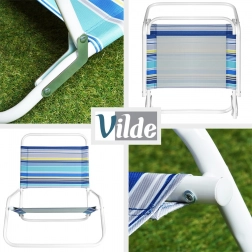 Skladacie plážové kreslo Vilde je ideálnou voľbou na pláž, kempovanie alebo oddych na záhrade. Nízka poloha sedenia (cca 18 cm) a príjemne naklonená opierka zaisťujú pohodlie pri opaľovaní aj čítaní. Ľahké, no pevné prevedenie uľahčuje prenášanie aj skladovanie.