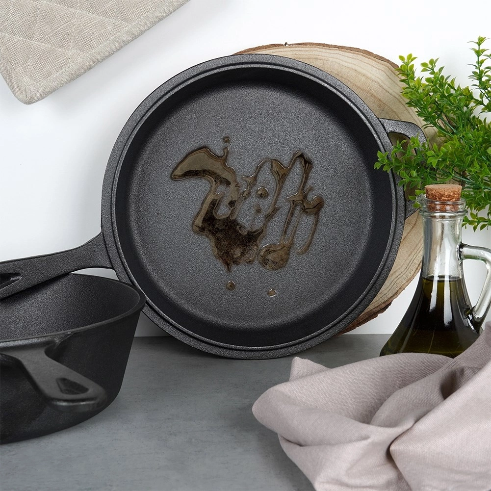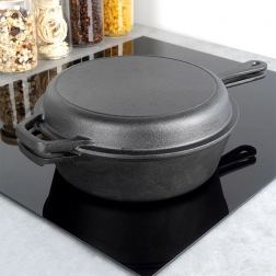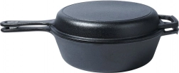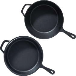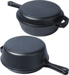 Robustná liatinová sada na univerzálne varenie: hlboký hrniec a plytká panvica, ktoré spolu dokonale ladia – panvica môže slúžiť ako pokrievka. Liatina zabezpečuje rovnomerné rozloženie tepla, dlhú akumuláciu a je ideálna na vyprážanie, pečenie aj dusenie na sporáku, v rúre aj nad ohňom. Odolná konštrukcia s dvojitými úchytmi a kompatibilita s plynom, elektrinou, sklokeramikou aj indukciou robí z tohto setu spoľahlivého parťáka do každej kuchyne aj na kempovanie.
