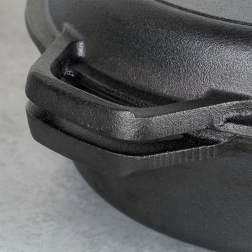Nádobie je vhodné na sporák, do rúry, na gril aj na otvorený oheň. Praktické dlhé aj pomocné úchyty uľahčujú manipuláciu a otvor v rukoväti umožní zavesenie. Správnou starostlivosťou (ručné umývanie, dôkladné vysušenie a ľahké naolejovanie) si liatina zachová dlhú životnosť.